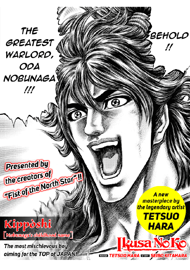 “The most feared / respected legendary warlord Oda Nobunaga, who disappeared from history just as he was about to unify Japan. He was born in war, raised for war, and grew into war. Nobunaga was a true “Child of War”! Tetsuo Hara draws the child character Kipposhi (Nobunaga’s childhood name) who is destined to become the fearsome figure that dominates the Sengoku Period. The only manga that tells the story of Nobunaga’s childhood days, this is a must-read for anyone interested in Japan and Samurai, as well as everybody who has that BOY at heart!”