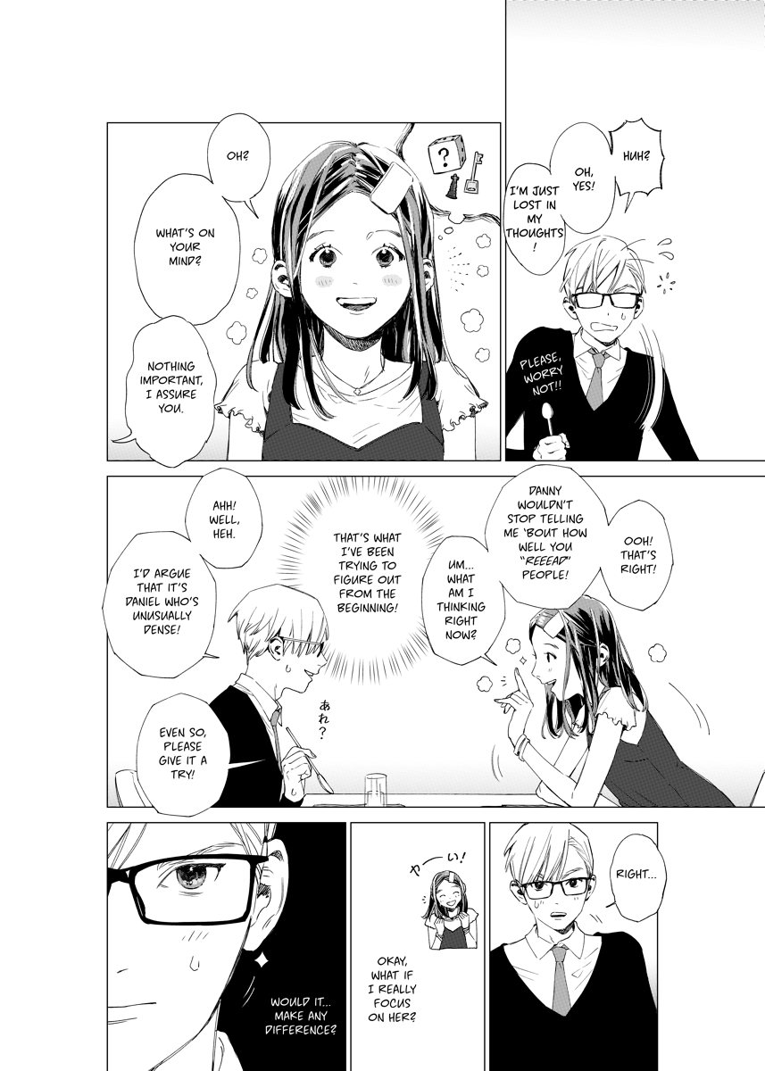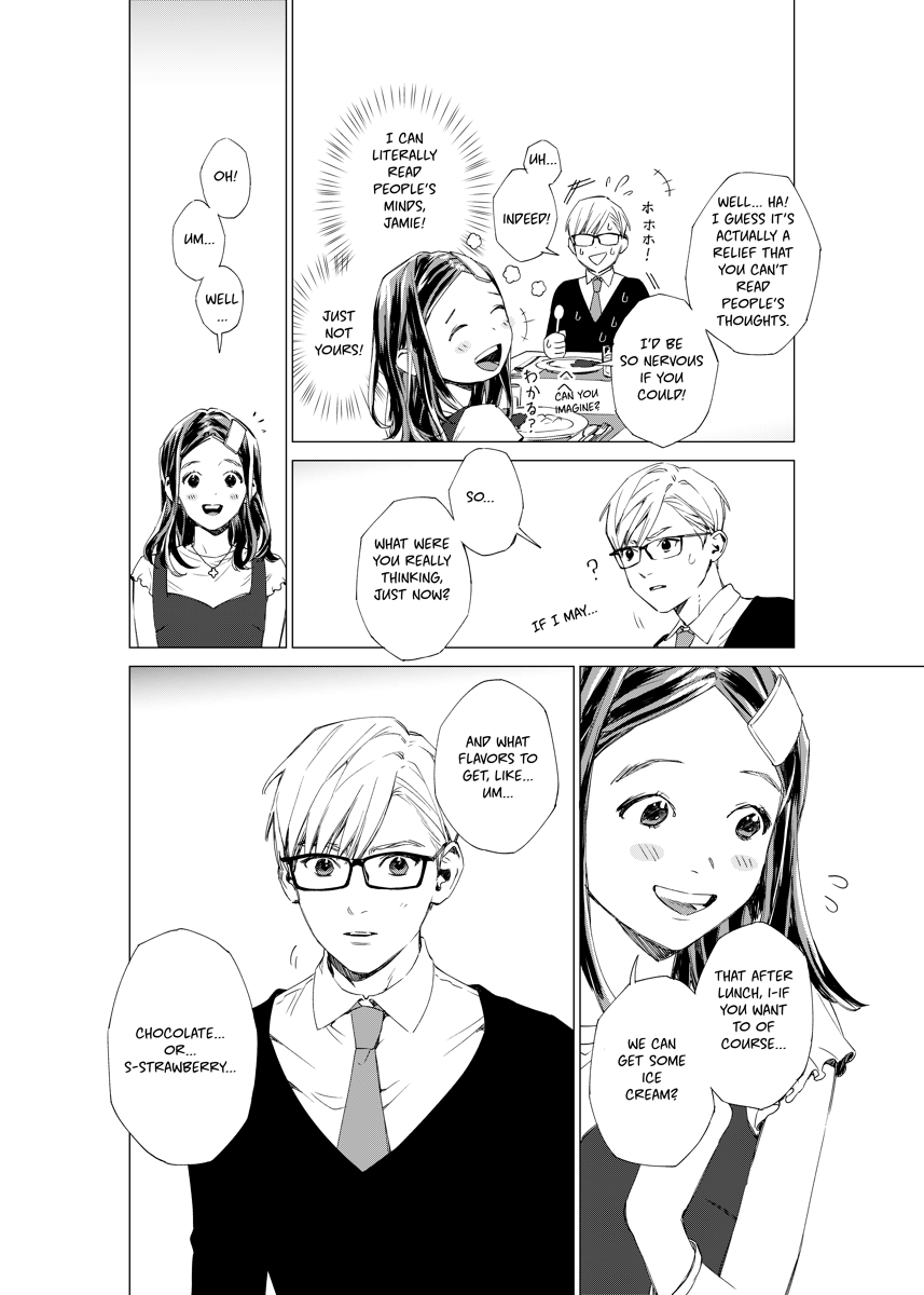 | “Elliot has a unique ability… he can read minds. Excluded from normal society, Elliot consoles himself with helping those need. After all, how can he get close to people when he knows every waking thought? But all this changes when his co-worker sets him up on a blind date.” | |