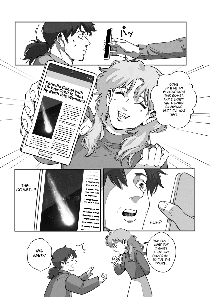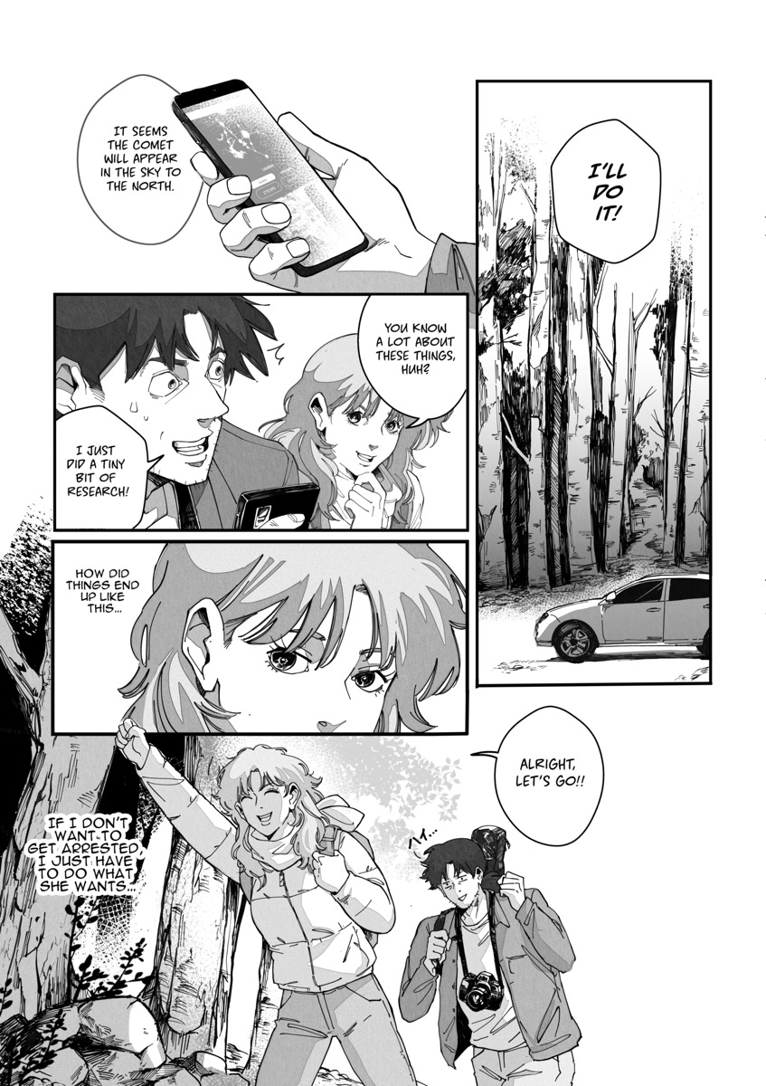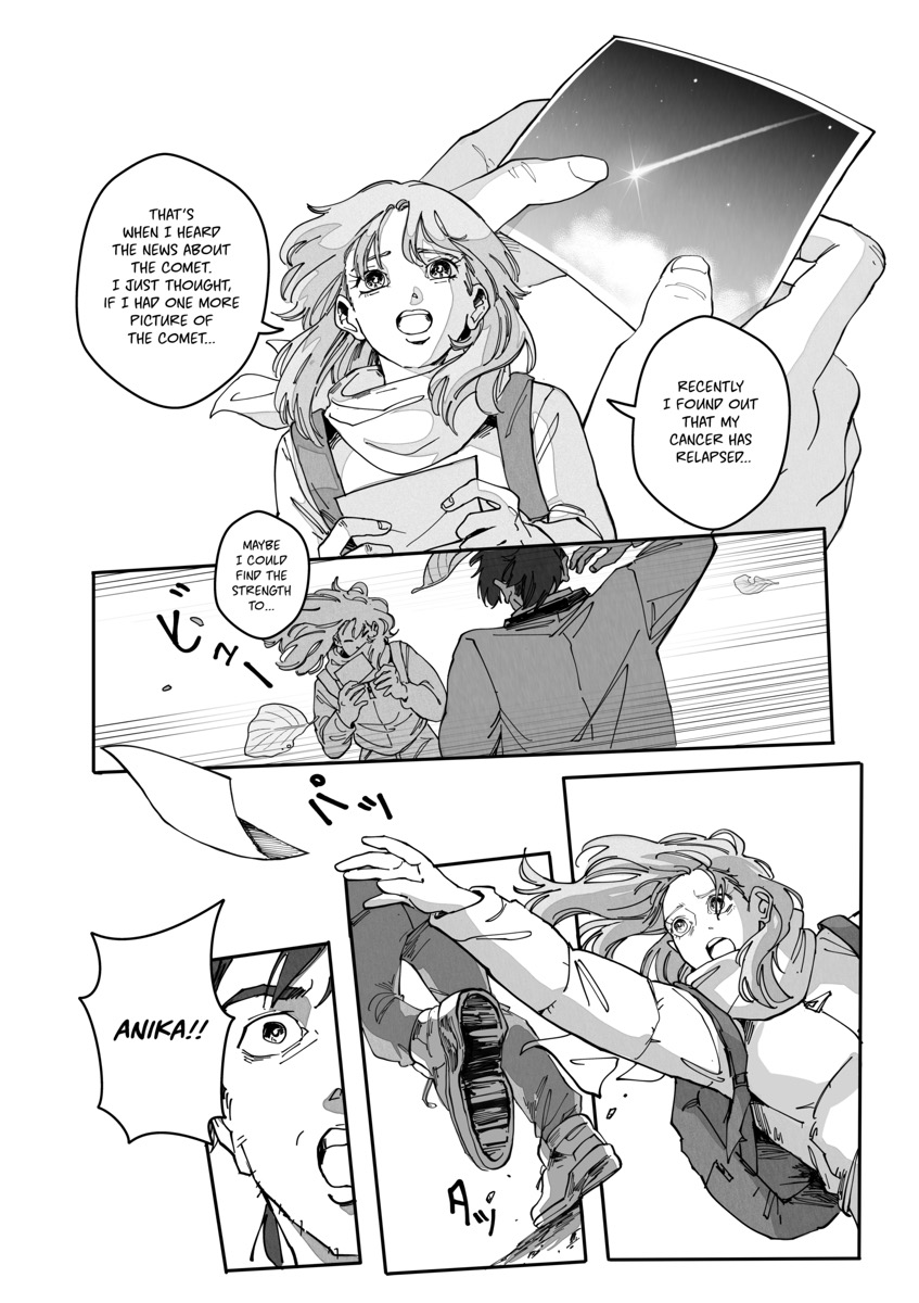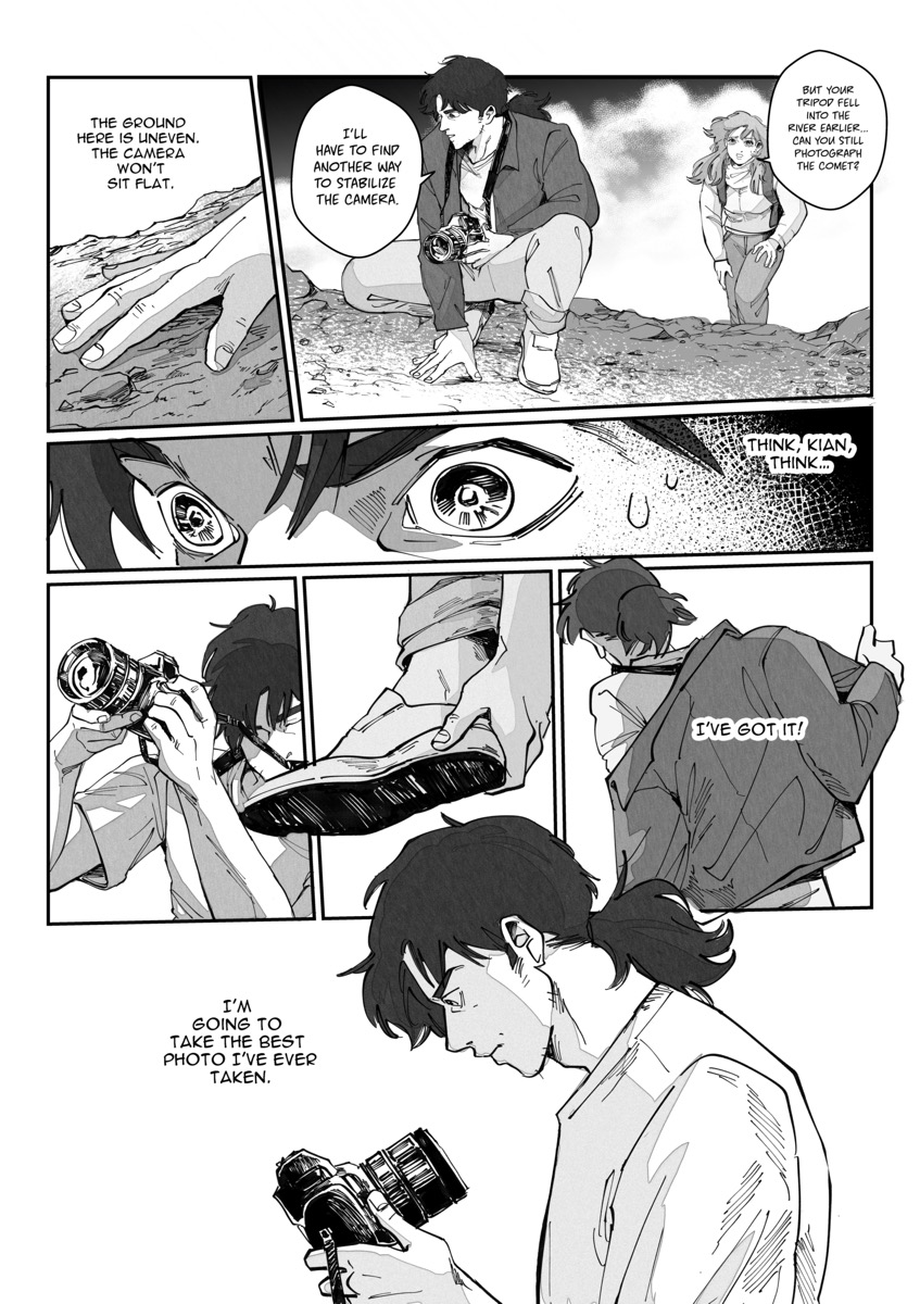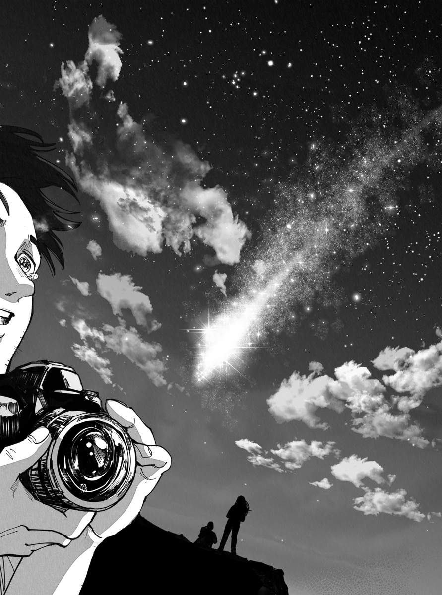 | “Kian gave up on his dreams a long time ago, and is now resigned to his job as a paparazzo. However, when he meets a mysterious young actress, long-suppressed feelings once again float to the surface. Do dreams ever truly die? Or do long-diminished dreams simply need a spark to reignite? Follow Kian and the actress, Anika, on their journey to photograph a rare comet, and in the process, find the bravery to dream.” | |