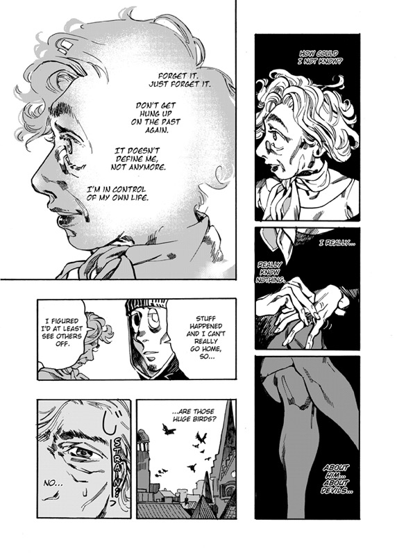 “"The Rabbit Who Ate the Moon" tells the story of Serena, who is haunted by an old love from her youth. Caught up in her feelings, Serena made a fateful promise to her demon lover, and as a result, she is cursed to feel a terrible physical discomfort whenever she is on the ground.The demon disappears from her life, leaving Serena to endure the curse and be haunted by memories of his love for years to come. Seeking momentary relief, Serena visits a bar in a skyscraper 100 meters above sea level, where she encounters another demon, Algol. To her surprise, she discovers that she and Algol have a lot in common… This love story from hell, by Finnish MasterClass member Don, won an Honorable Mention in the 28th Comic ZENON Manga Taisho Award!”