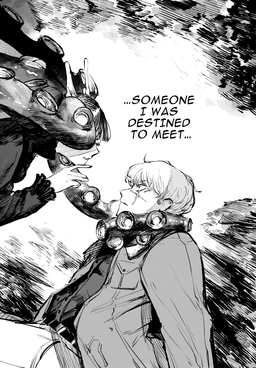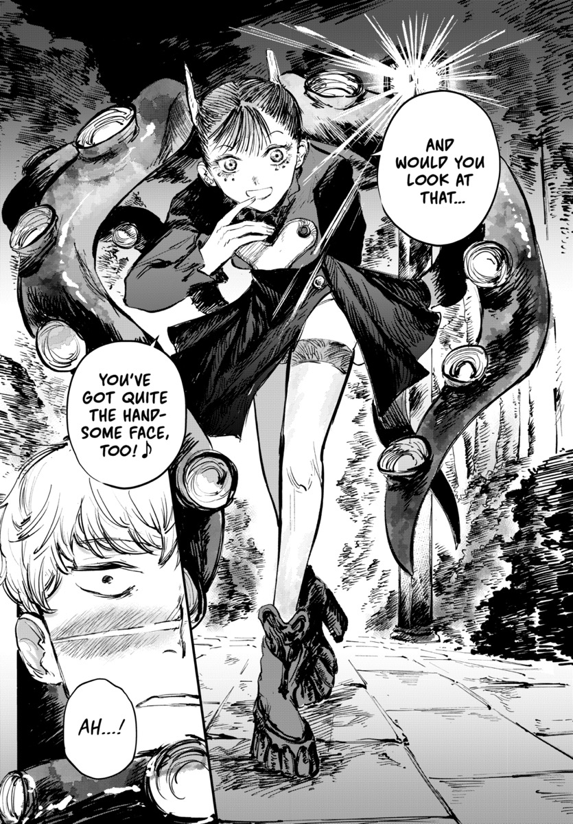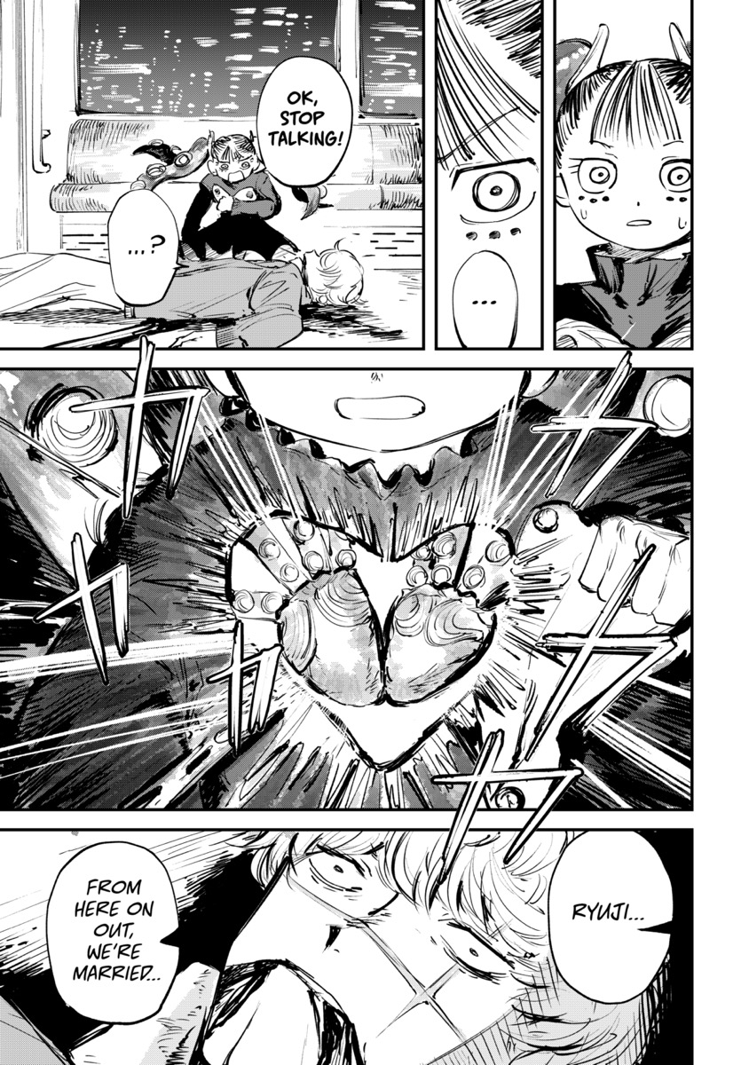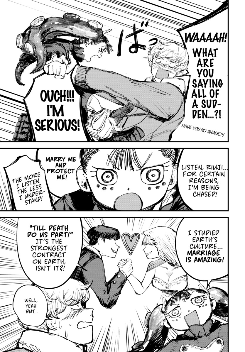 | “Ryuuji has an innocent dream: to get married and have a happy family. However, his intimidating appearance and lack of social skills make him entirely unappealing to women, and every date he goes on ends in disaster. One day, a peculiar but beautiful woman appears before him, claiming to be an alien and suddenly proposing marriage! The strongest social contract on Earth sets off an uproar of a cosmic scale. This new one-shot by monotone_ink, winner of both the Kyushu International Manga Award and the Comic ZENON Manga Taisho, invites you to enjoy a grand spectacle of space, intergalactic battle, and love! ” | |