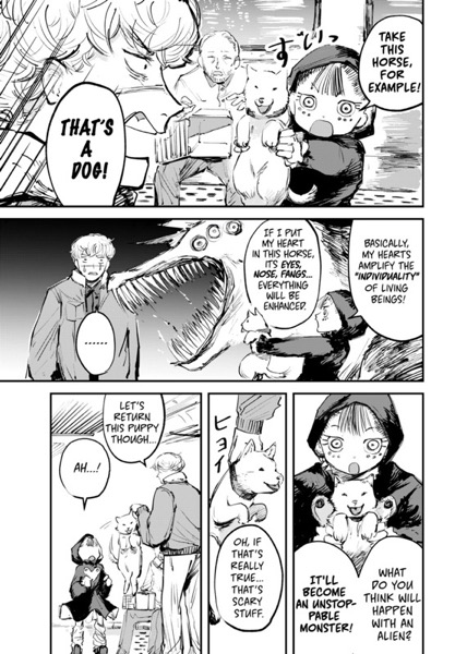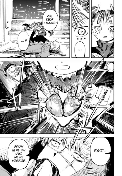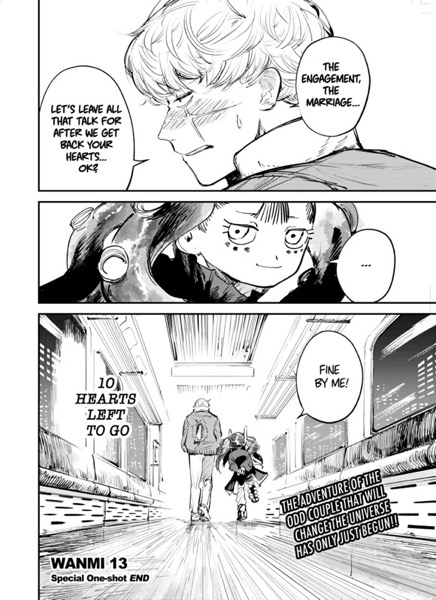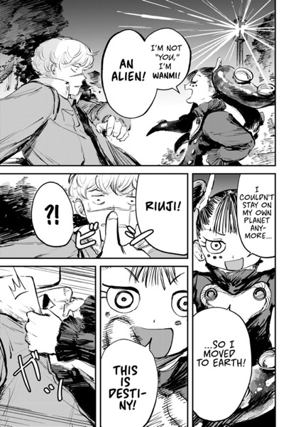 “Ryuuji has an innocent dream: to get married and have a happy family. However, his intimidating appearance and lack of social skills make him entirely unappealing to women, and every date he goes on ends in disaster. One day, a peculiar but beautiful woman appears before him, claiming to be an alien and suddenly proposing marriage! The strongest social contract on Earth sets off an uproar of a cosmic scale. This new one-shot by monotone_ink, winner of both the Kyushu International Manga Award and the Comic ZENON Manga Taisho, invites you to enjoy a grand spectacle of space, intergalactic battle, and love! ”