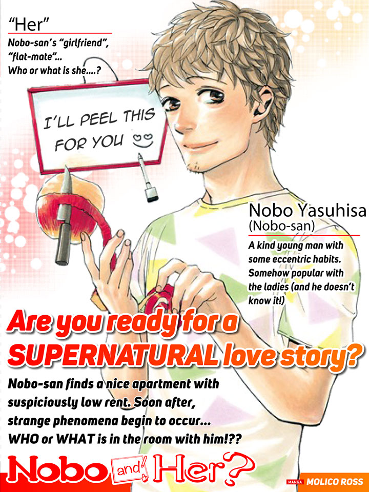 | “Invisible but cute? Sweet life with a ghost girlfriend ♥ Rumours are flying around college that Yasuhisa Nobo has a new girlfriend… but no one has ever seen her?! The heart-warming tale of the (for some reason?!) popular Nobo and his invisible ghostly girlfriend♪” | |