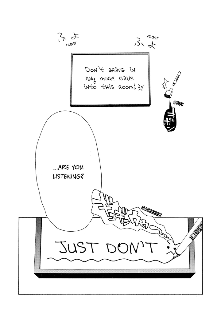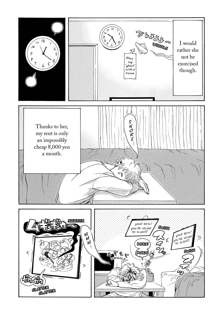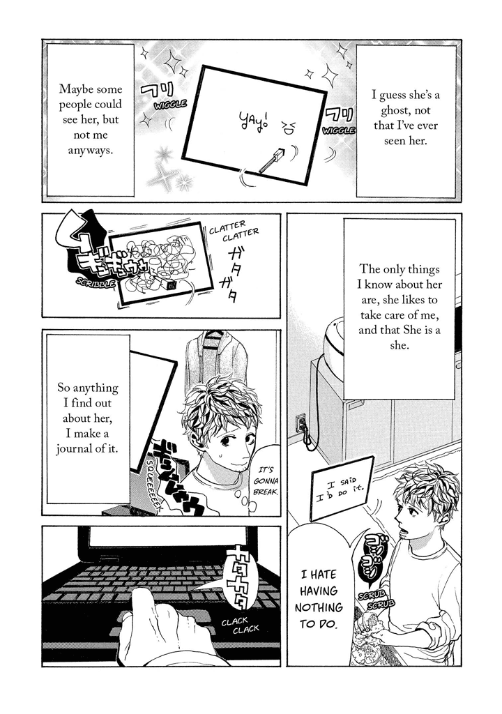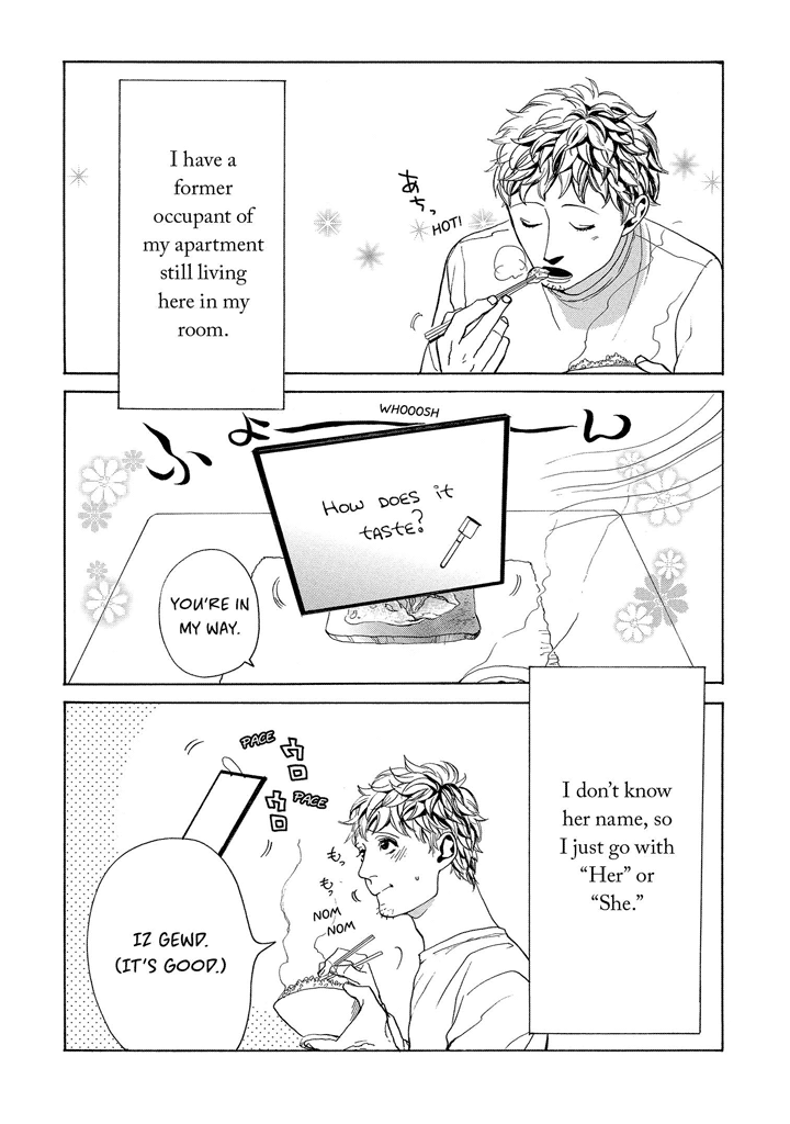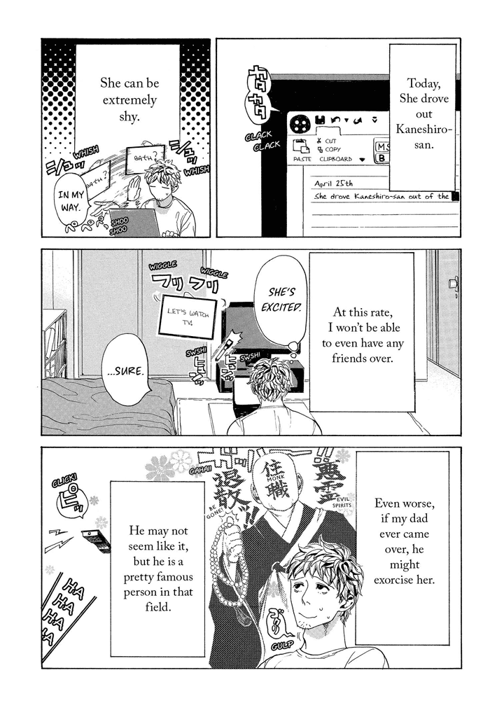 | “From the Editor: The “ghostly girlfriend” is never drawn anywhere in the manga. Instead, she communicates by writing on a whiteboard, and by moving various objects in the room. It’s amazing how much of her emotions really come across, without ever seeing her! You’ll discover just how cute she is ♥ She only exists in each reader’s imagination, as the ideal girlfriend. Read this once, and you too will fall in love with her too♪” | |