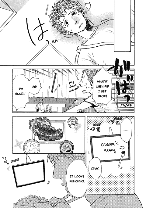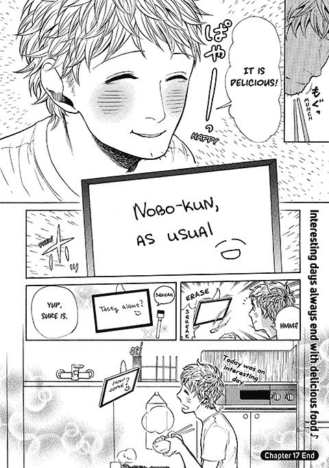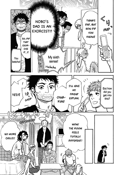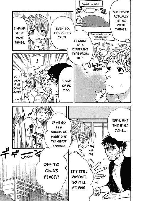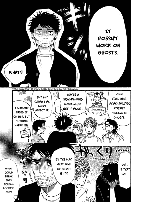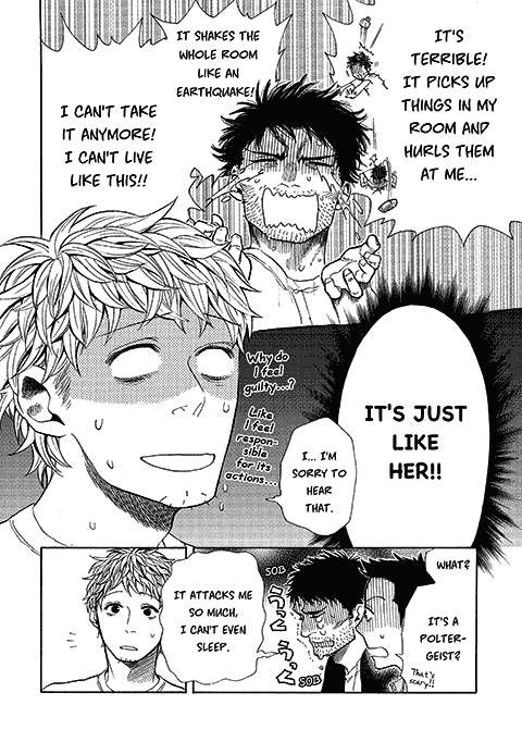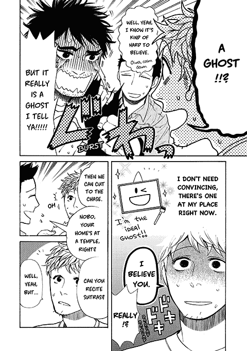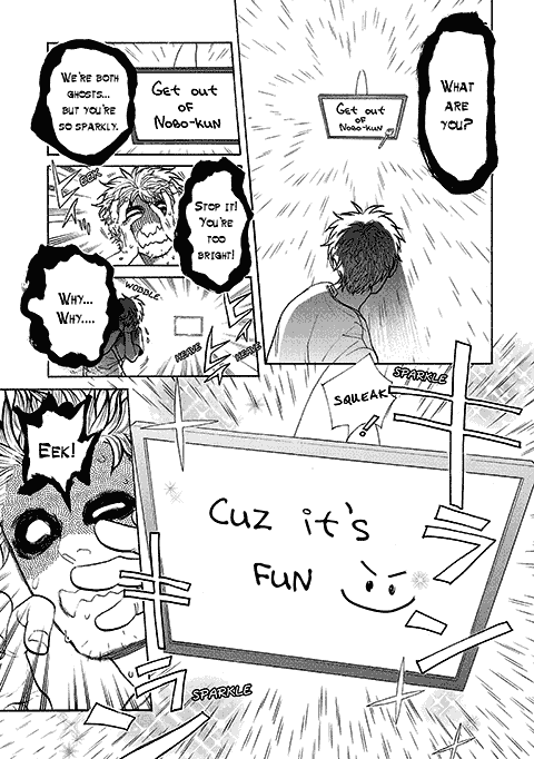 “From the Editor: The “ghostly girlfriend” is never drawn anywhere in the manga. Instead, she communicates by writing on a whiteboard, and by moving various objects in the room. It’s amazing how much of her emotions really come across, without ever seeing her! You’ll discover just how cute she is ♥ She only exists in each reader’s imagination, as the ideal girlfriend. Read this once, and you too will fall in love with her too♪”