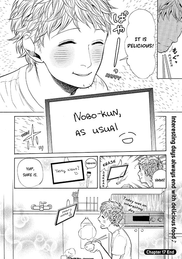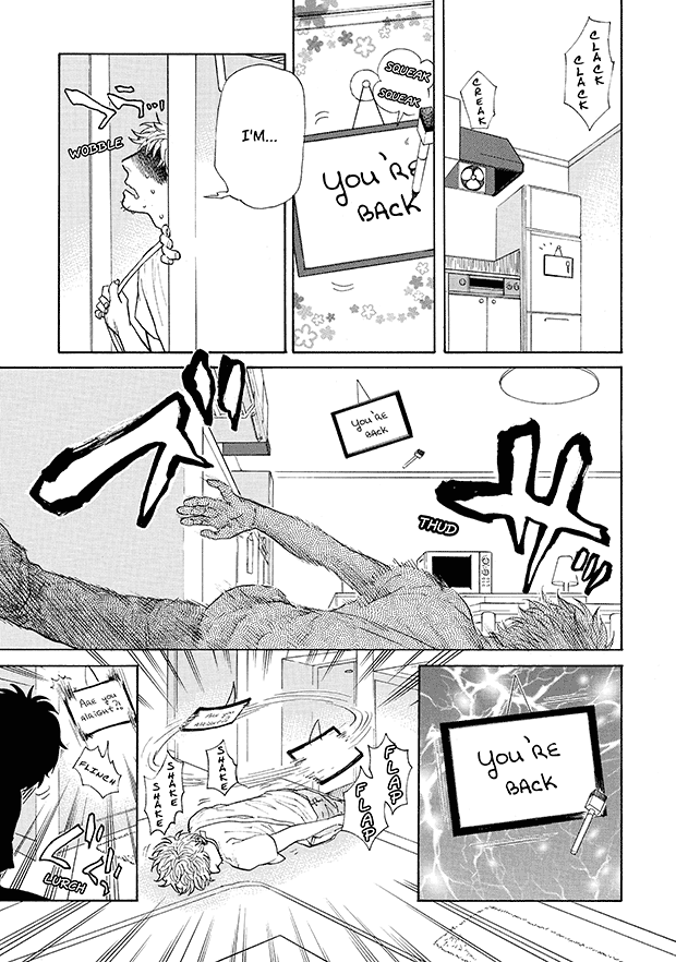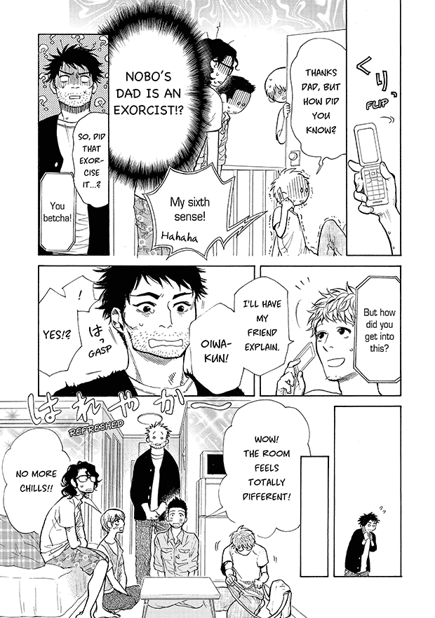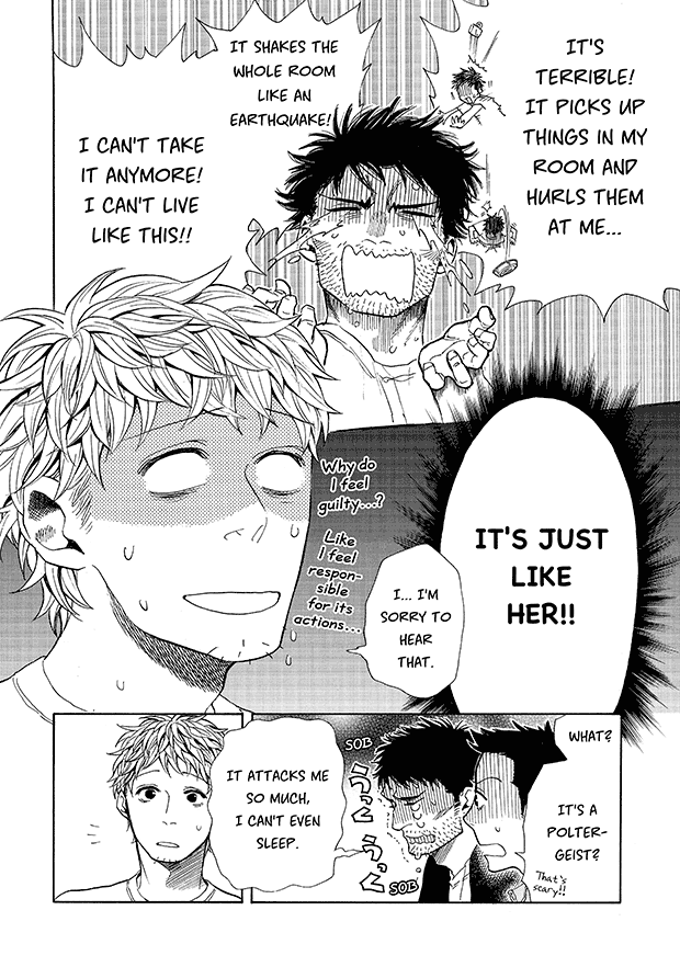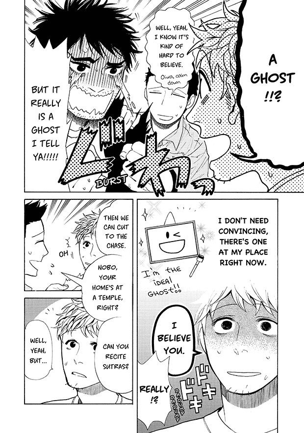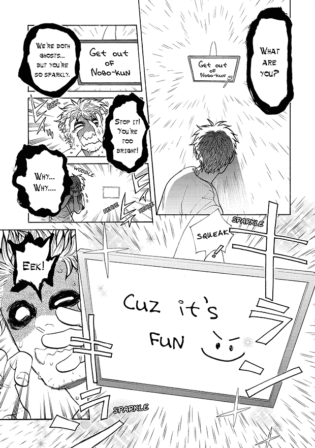 “From the Editor: The “ghostly girlfriend” is never drawn anywhere in the manga. Instead, she communicates by writing on a whiteboard, and by moving various objects in the room. It’s amazing how much of her emotions really come across, without ever seeing her! You’ll discover just how cute she is ♥ She only exists in each reader’s imagination, as the ideal girlfriend. Read this once, and you too will fall in love with her too♪”
