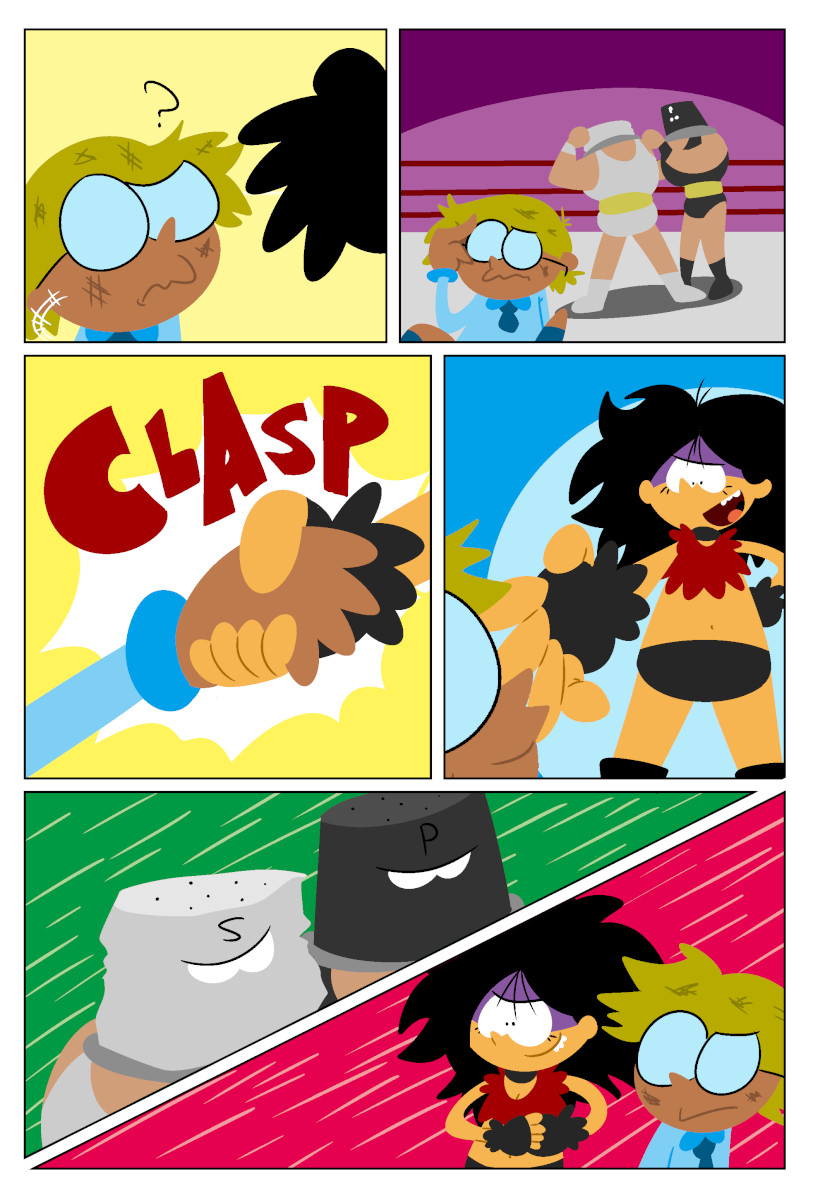 | “Drawing Pomme, the wild wrestler, and her expressions. Wild and fun! As well as the tag team duo being based on salt and pepper shakers for visual amusement.” | |