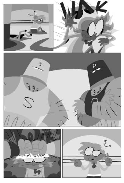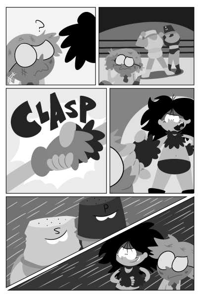 | “Drawing Pomme, the wild wrestler, and her expressions. Wild and fun! As well as the tag team duo being based on salt and pepper shakers for visual amusement.” | |