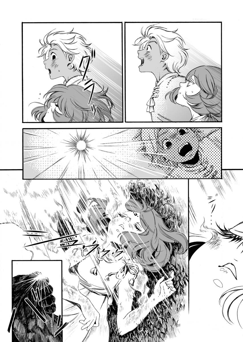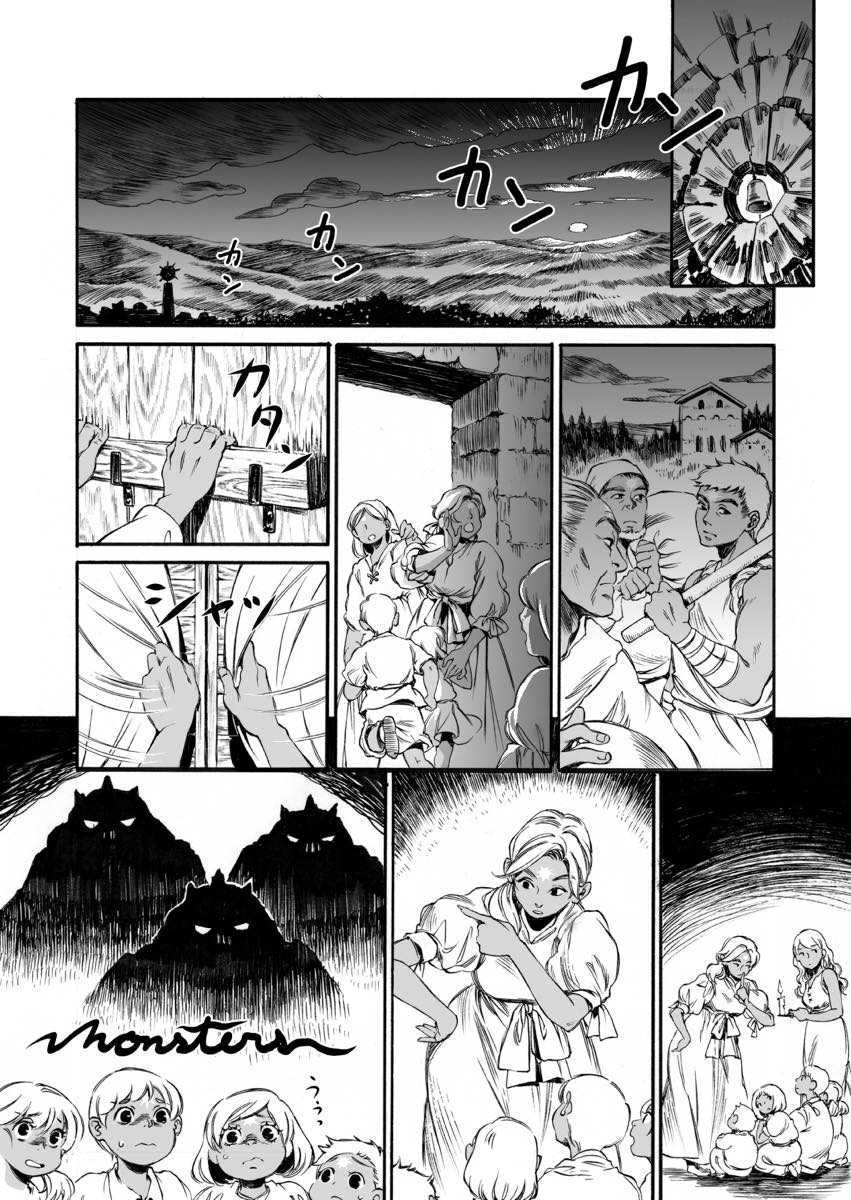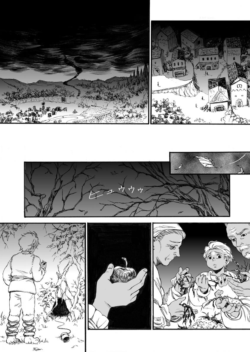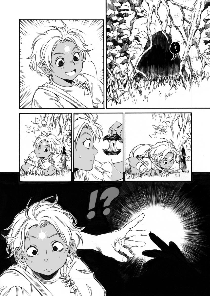 | “My favourite part is the last page where the heroine, now grown up, still carries the scars of her brave action that made the 2 races to eventually develop mutual understanding. The gray speech balloon represents that even their language changed to something they share, neither light nor dark.” | |