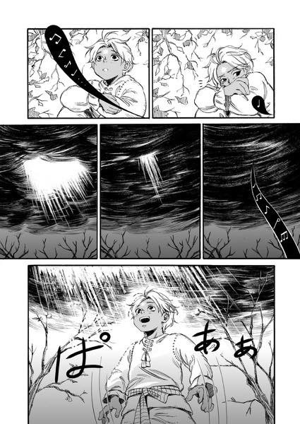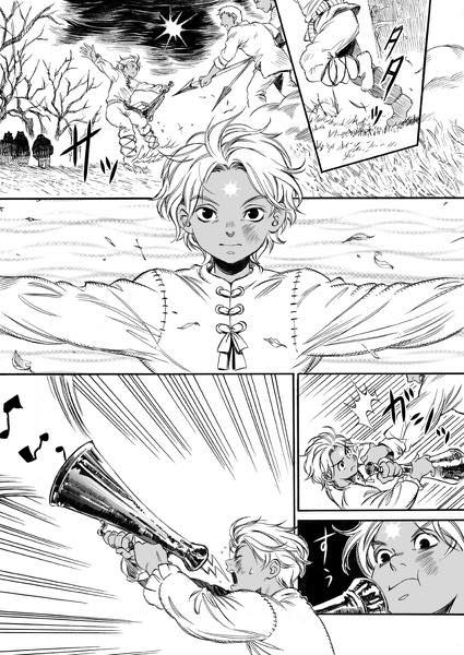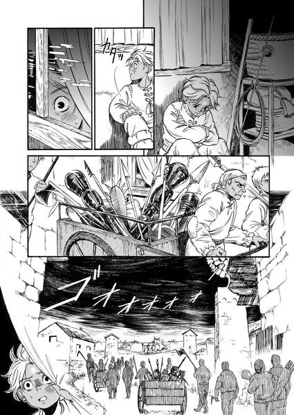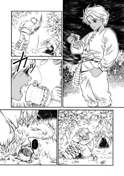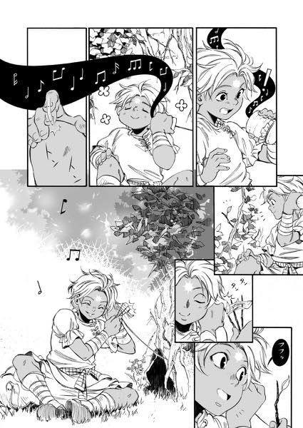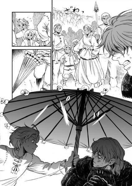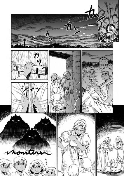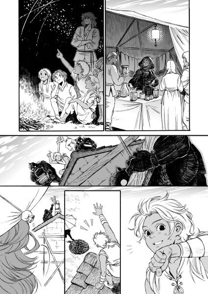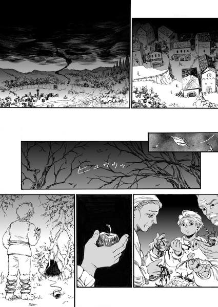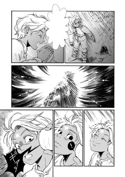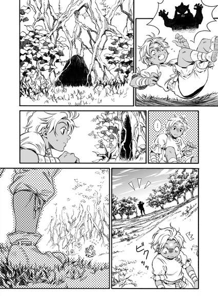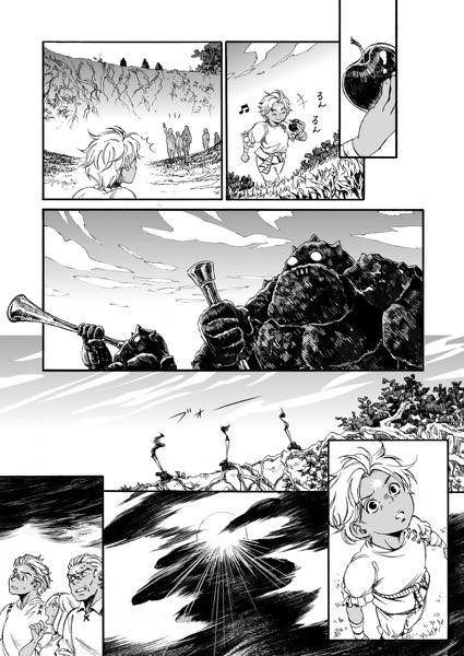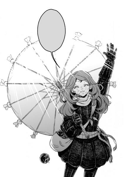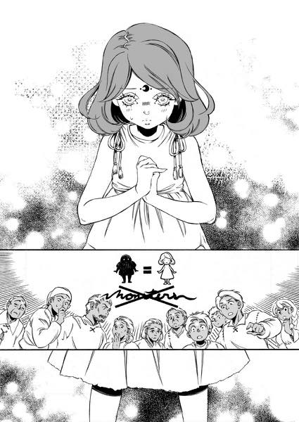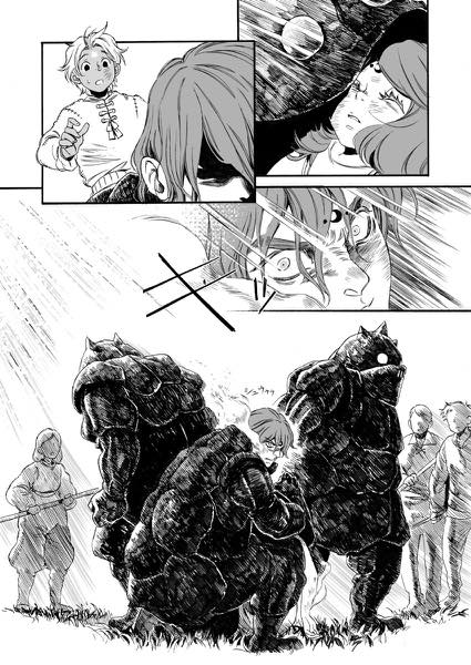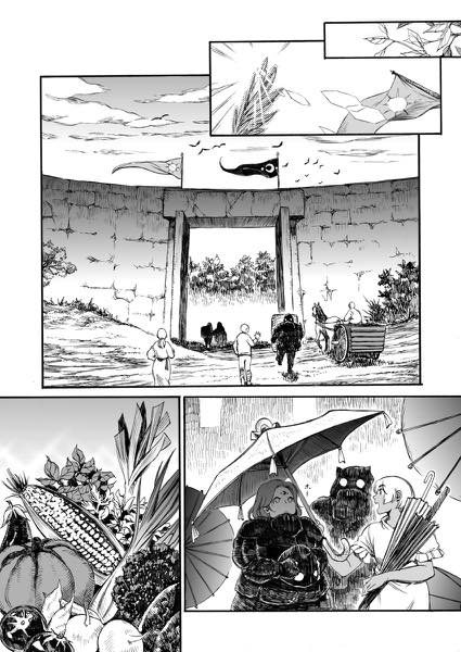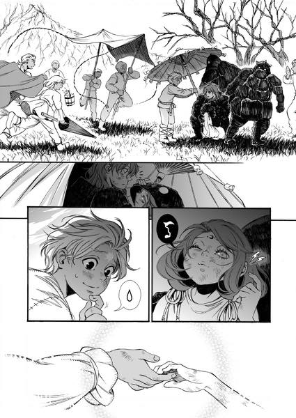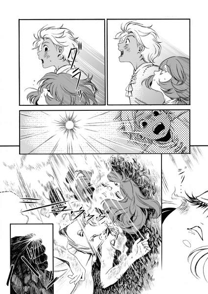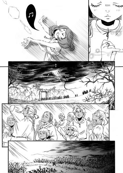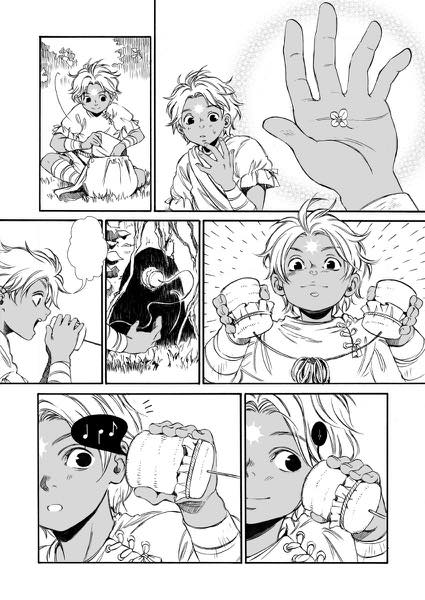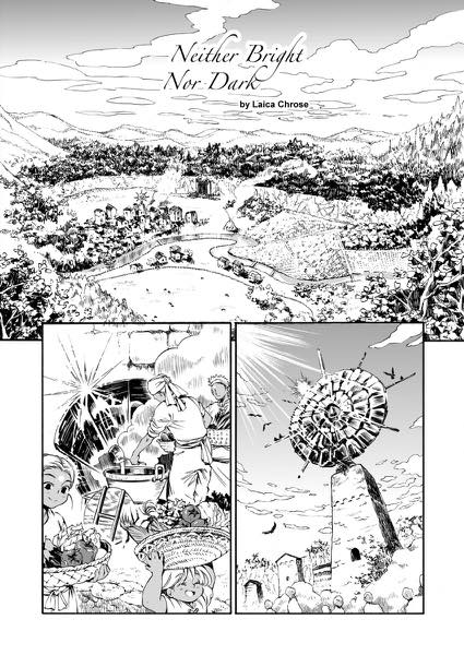 | “My favourite part is the last page where the heroine, now grown up, still carries the scars of her brave action that made the 2 races to eventually develop mutual understanding. The gray speech balloon represents that even their language changed to something they share, neither light nor dark.” | |