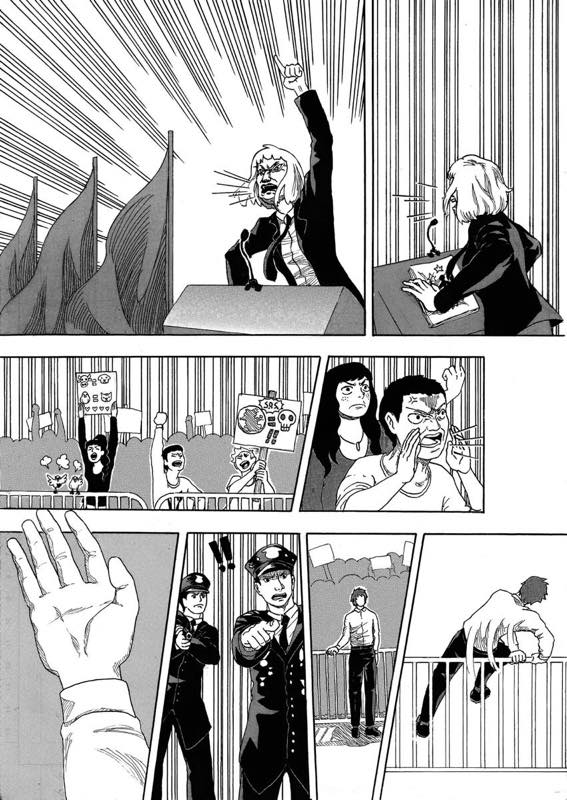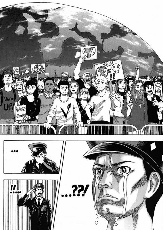 | “It has been tough for me to look at the world without grief these past few months. I have a very strong political opinion on how the leaders of today are not doing nearly enough to fight climate change and to bring solutions to the many unnecessary ongoing man made problems that keep damaging the world every single day. Although I don't get too deep into it, this manga was my way to rebel. My favourite part is right after the politician lady gets handcuffed, when the main character takes her regime, shreds it to pieces and throws it into the air. Although it is open to interpretation, I feel like he is stating "we've had enough of this!". The crowd celebrating afterwords is truly how I feel about that scene.” | |