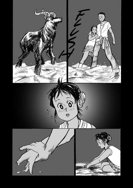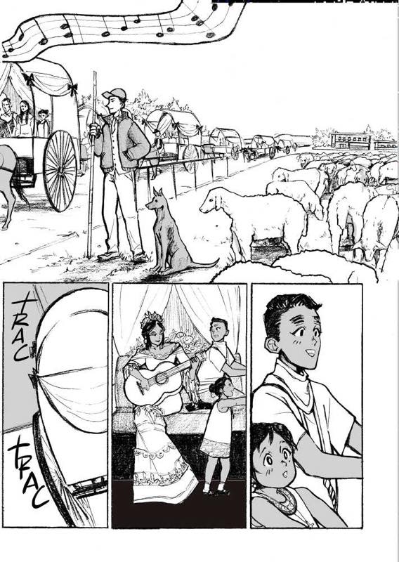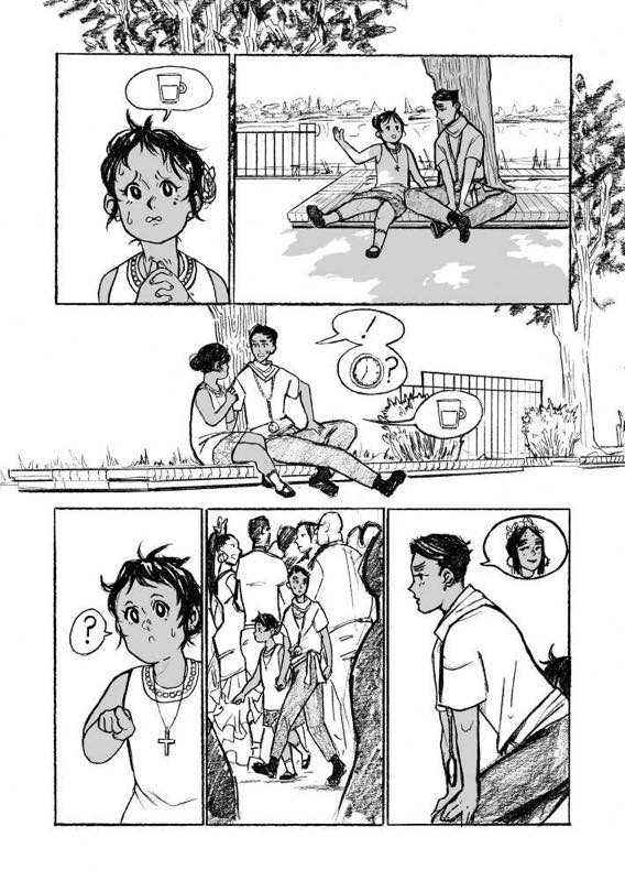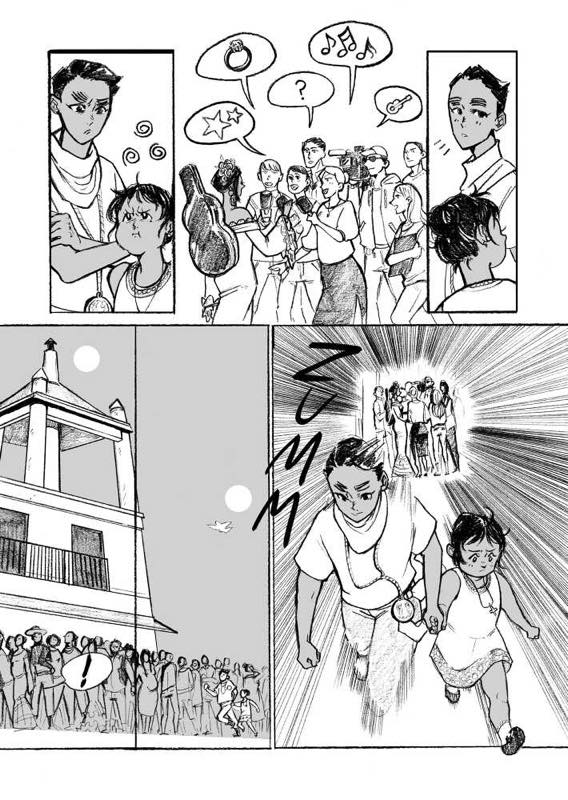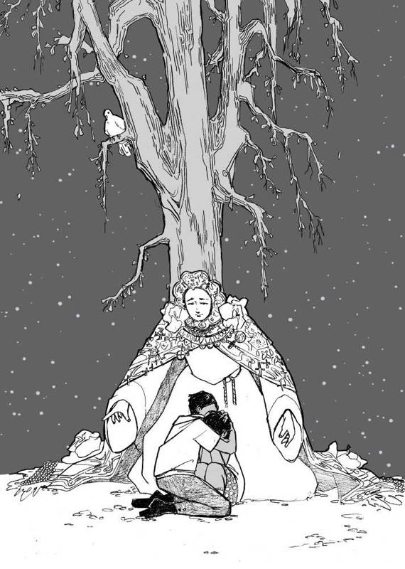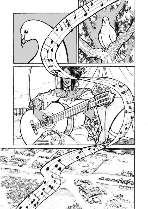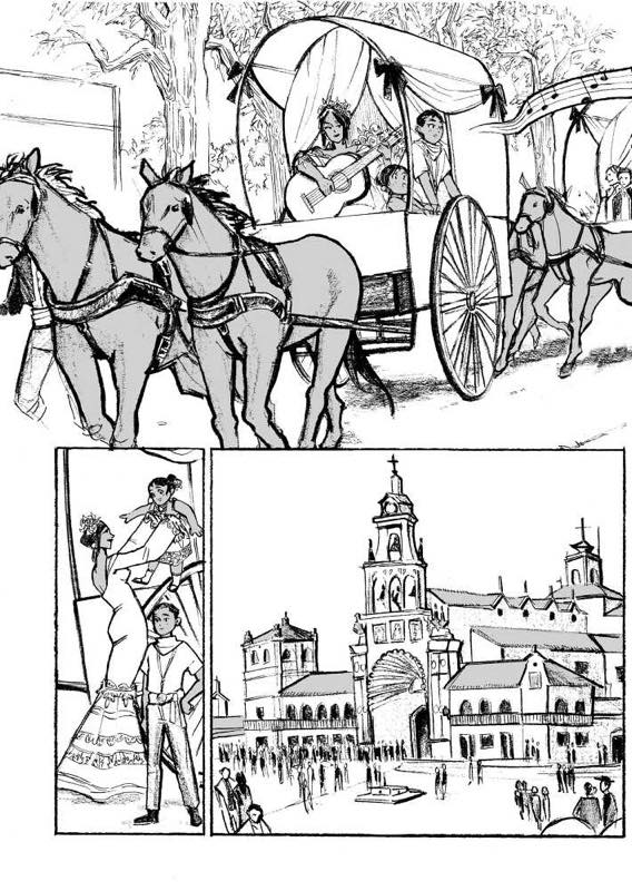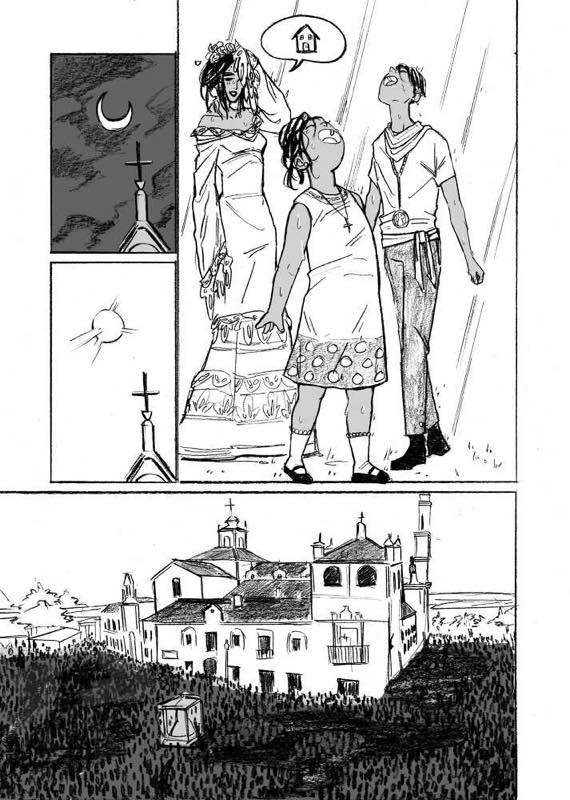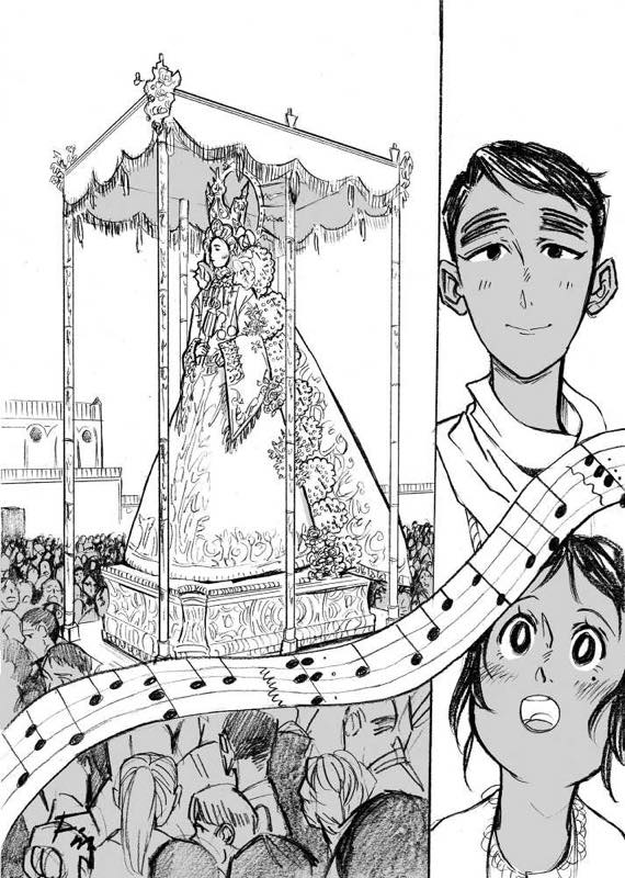 | “This is a story about the Virgen del Rocío, the local patroin saint of Huelva. She is very popular and lots of people gather each year to pay respects and celebrate. ¨¨White Dove¨ and ¨Queen of the Marshlands¨ are her two other titles. They are a couple of legens about her, but I decided t create my own including elements of the previous ones, so this is an original tale.” | |