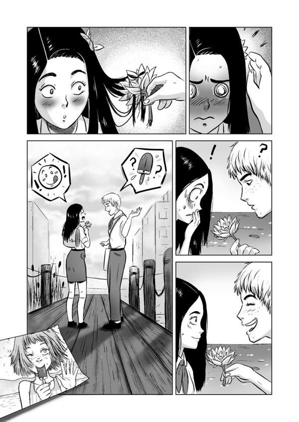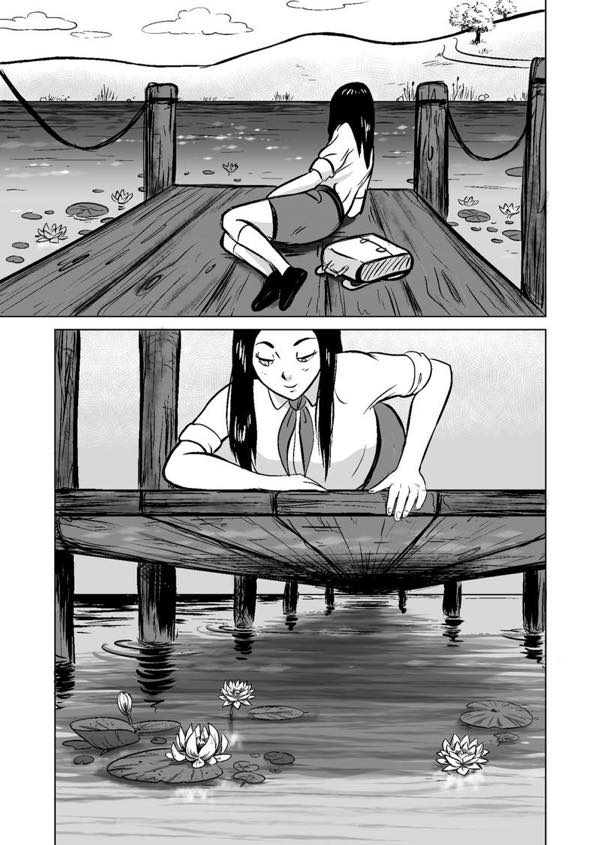 | “My favourite part is in the middle of the story, when the main character is drawn into the water – a surreal or irreal world. The water can be seen as a symbol for emotional security, healing and spiritual cleansing. For a moment the main character forgets all her sorrows - the inner journey begins.” | |