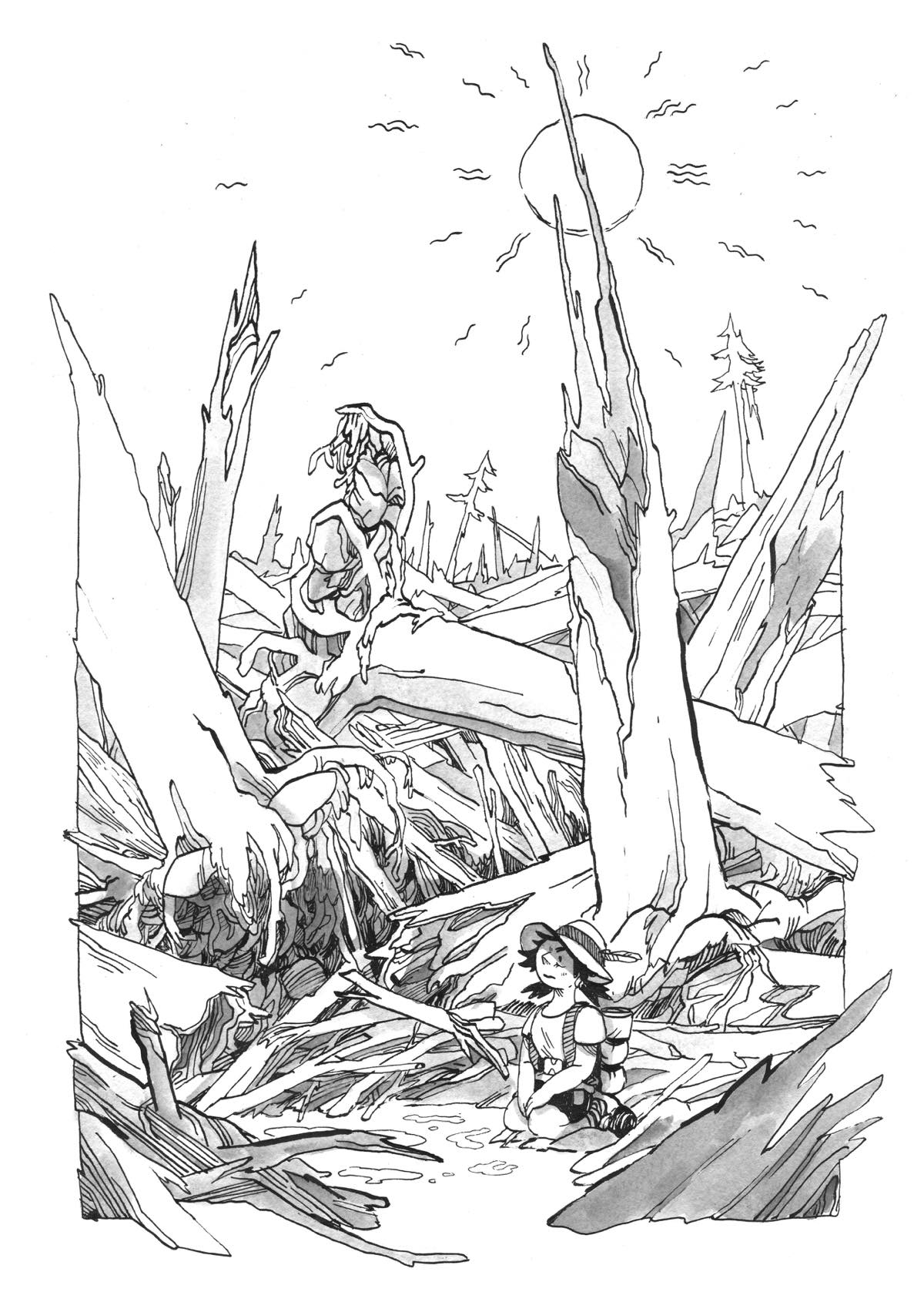 “I tried to draw feelings of the place. The forest in ruins is crying. Crying out memories of the terrible storm. Crying so much that it even reaches the mind of the traveler that is just passing through this calamity.”