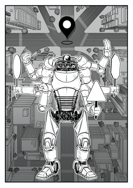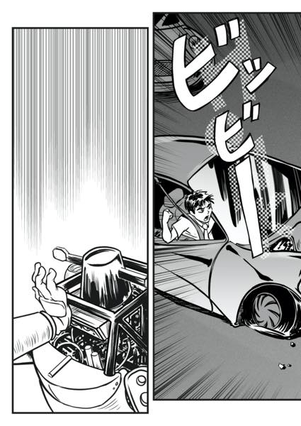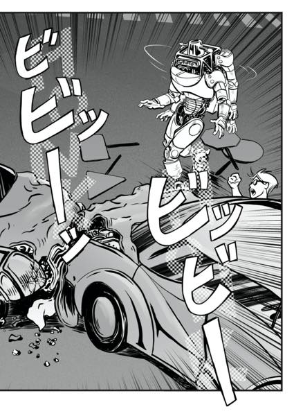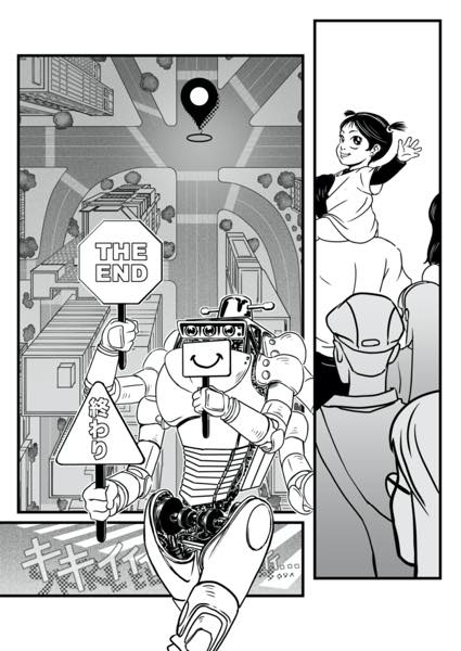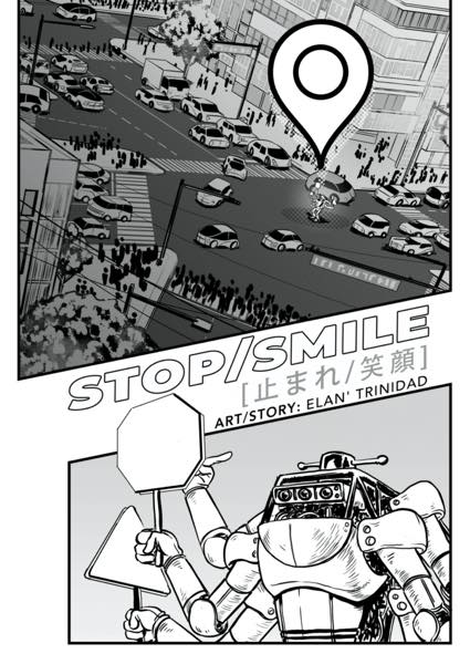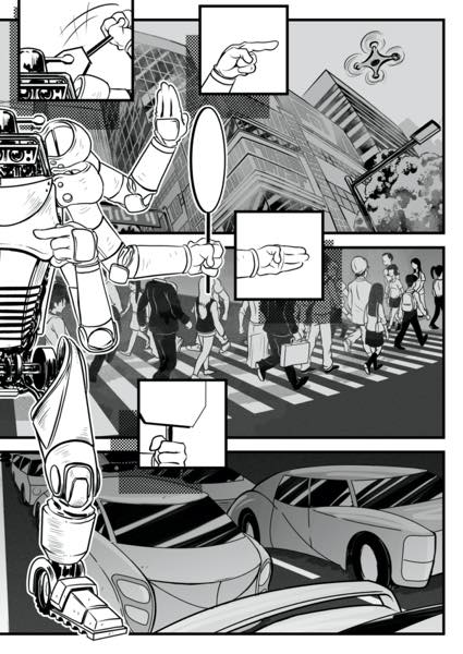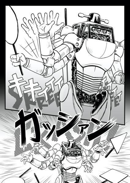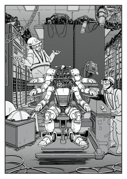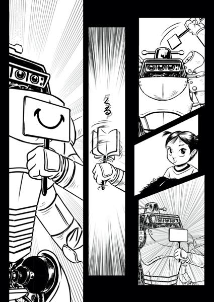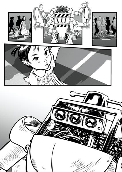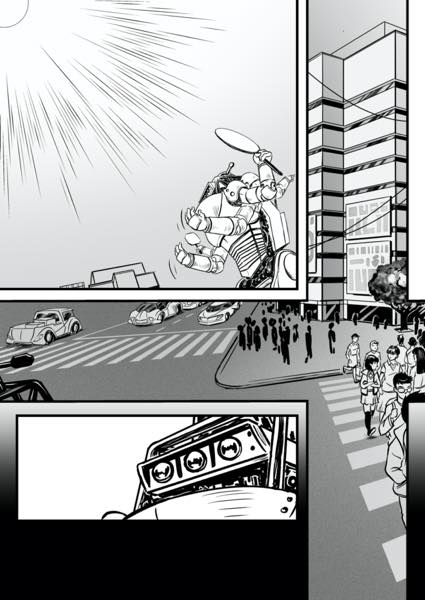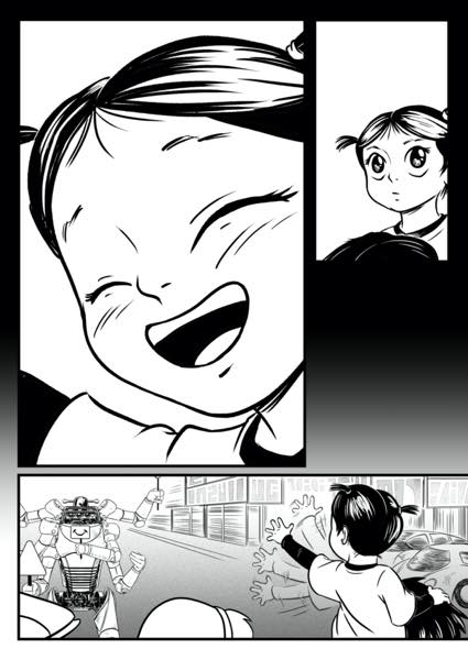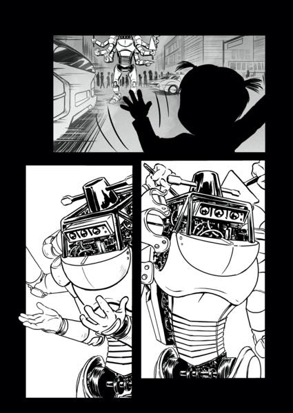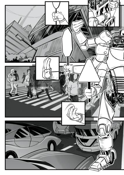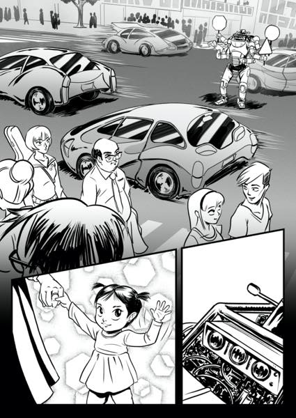 | “I made Japanese sound effects with English translation as a drop shadow. I don't know if that's ever been done before and I hope I'm the first to do it. I also like page 12 where the robot is going through a diagnostic.” | |
