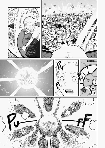 “The first image that came to my mind was that of a child looking at a drawing against the light, I think it is something that any cartoonist can identify with! Designing a flower-shaped robot was fun too.”