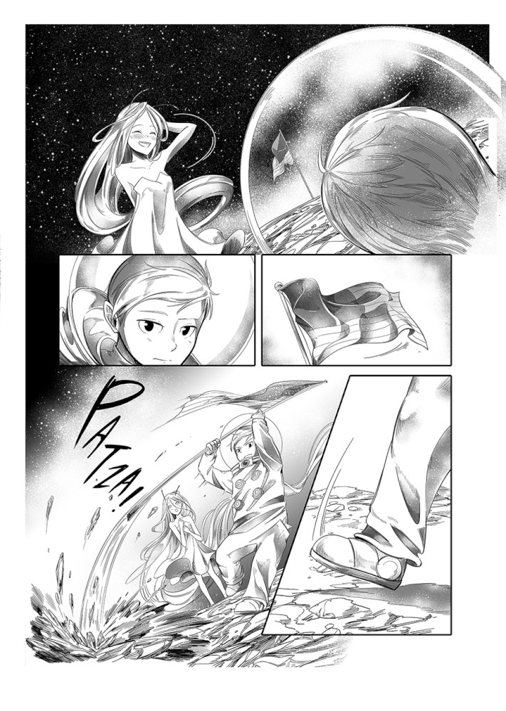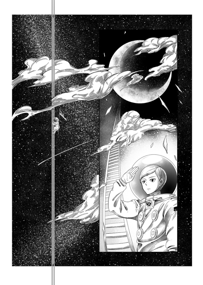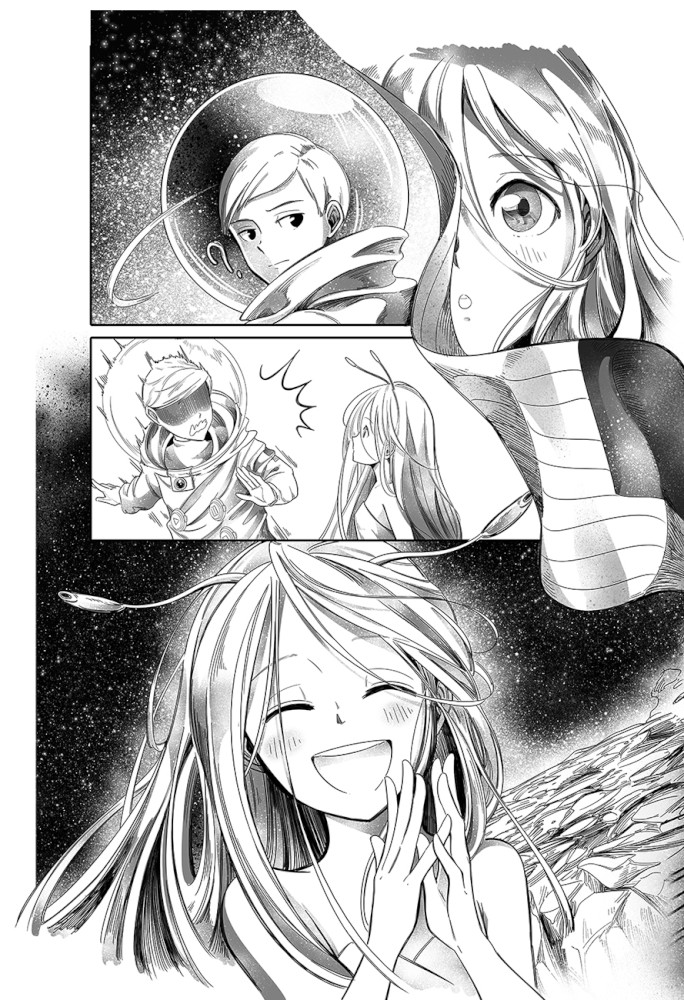 | “Human long forgotten how to smile or they never know how. Human sent out the astronaut to concur the planet above, astronaut then met the alien who has a expression he've never seen before. Alien welcomes him, offers everything she have, until the astronaut has to leave, she gave him a goodbye gift, and hoping he had a good time. Even they don't have the same language nor they can even hear them selfs in space, the astronaut felt worm and joyful for such friendliness that gives him his first smile ever. He can see she has nothing, other then her beautiful smile and this empty planet, the least he can do is to not take away her home. Astronaut's departure also made alien understand what lonely felt like, but what the know didn't know is, he spread this joy to everyone on earth, and he'll never forget her, and since he's a astronaut, he'll visit again for sure. Fun fact: Hair of the alien represent length she've been living on the planet alone.” | |