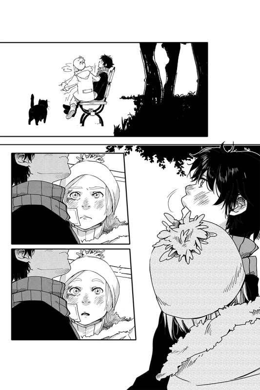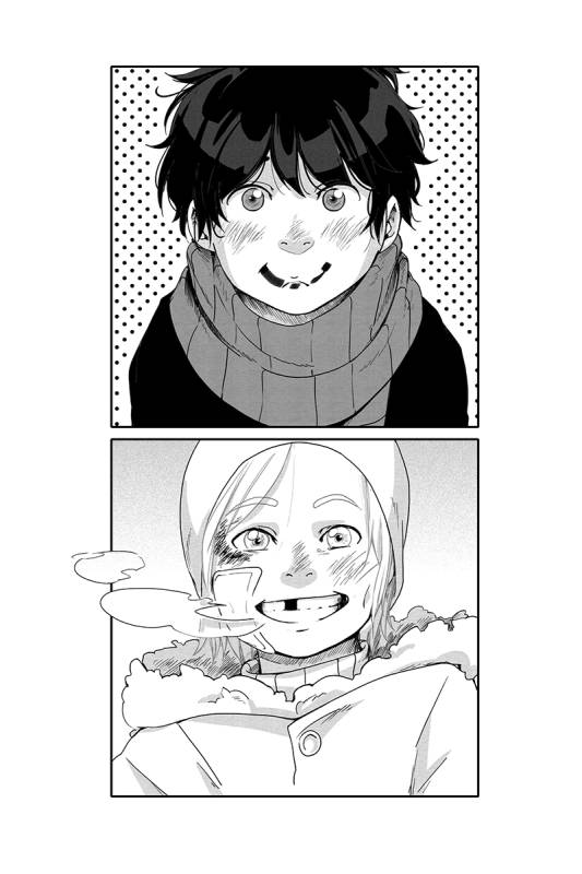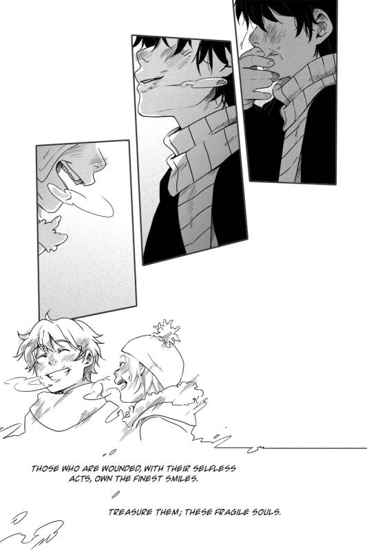 “I take extra care with showing emotions and the variety of expressions even for the same emotion in each of the two boys' faces is what I like and I enjoyed to draw most. I wanted to tell a story about the white haired boy's dedication to make the other lonely boy in the park smile, even though the first boy is obviously hurt more than the latter. I hope the reader also smiles upon reaching the page both boys smile in. I think we should spread smiles selflessly, by any mean possible, more.”