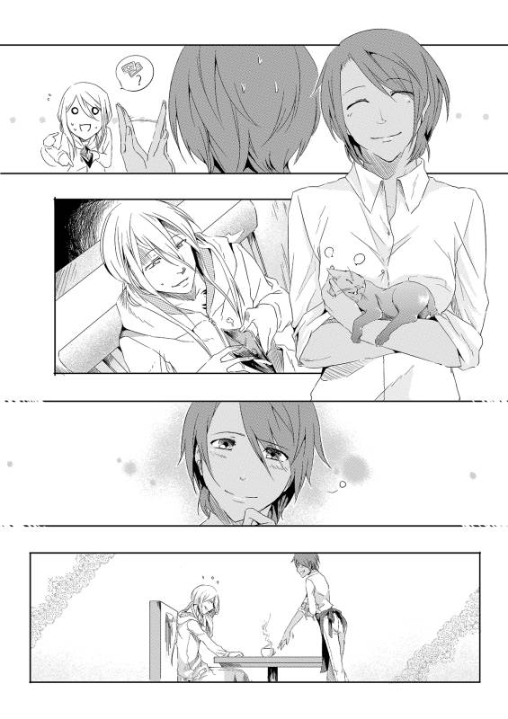 | “It is not my place to say, but the best part of the manga is seeing those sweet characters come alive. Each character has a name, has a story. Each customer in the setting has a name. We even named the cat. But for something more noticeable, the best part of the manga is when the cat runs away from the boy, and when everyone - even the coffee - smiles in the end.” | |