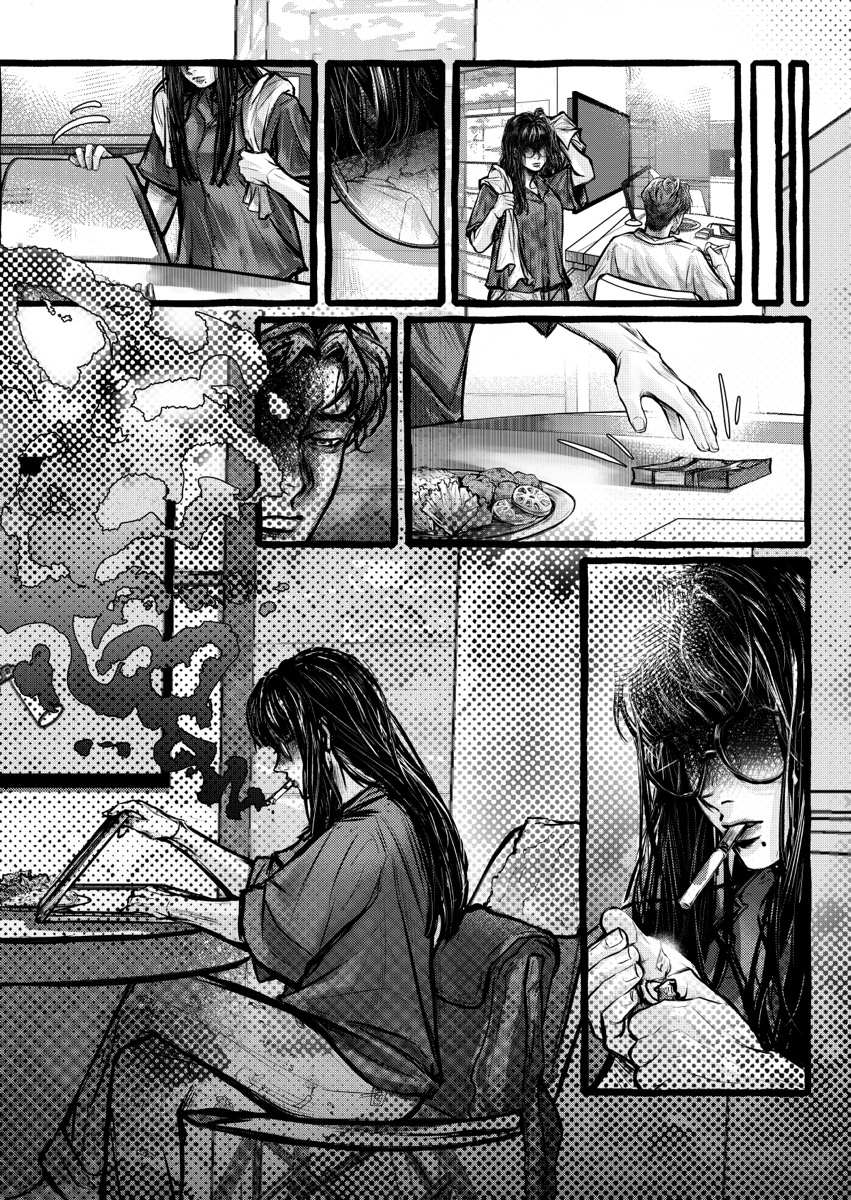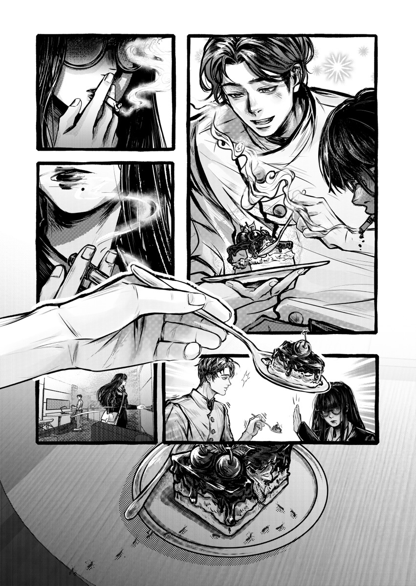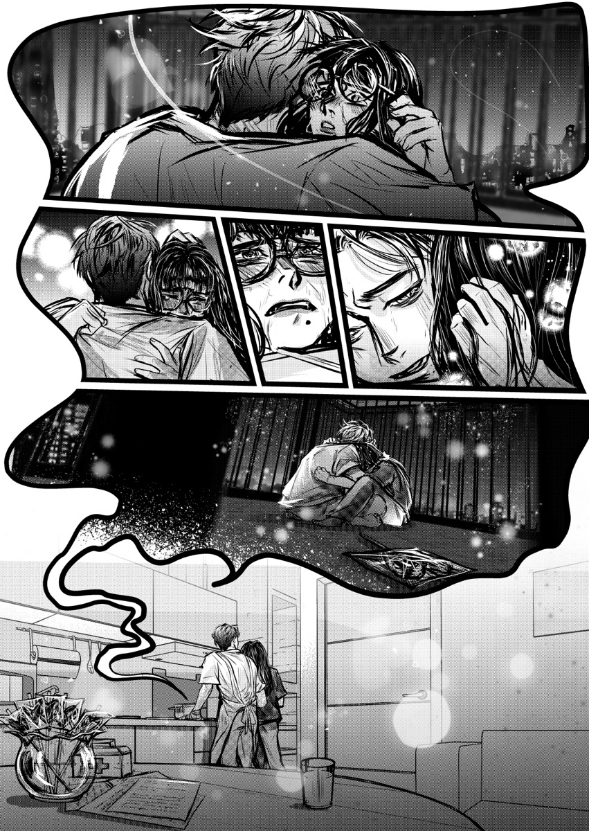 “My favorite part of the story is the spread page, where I tried to draw a broken heart between the pages. I truly wanted to show the heartache both of my characters are going through, but can't convey their feelings. Therefore, it shows whats boiling inside of them, metaphorically and artistically.”