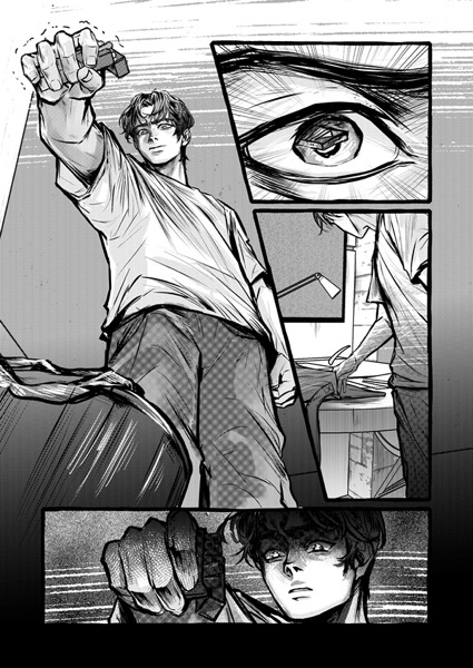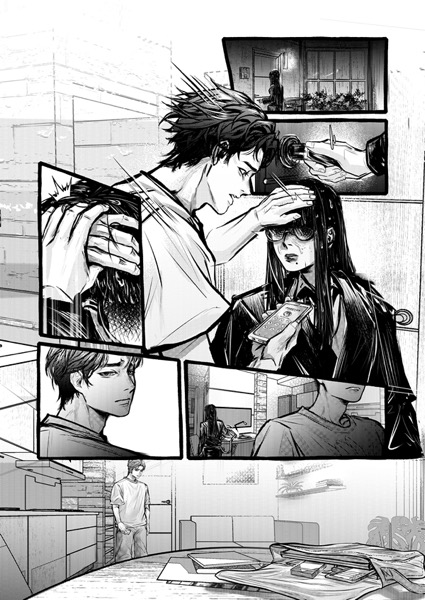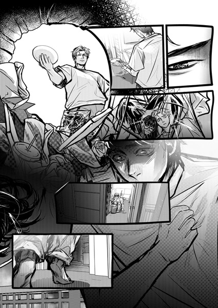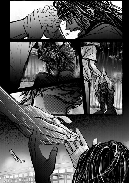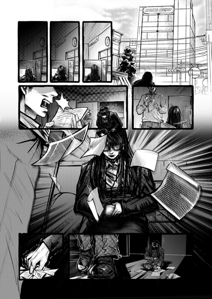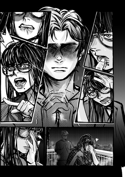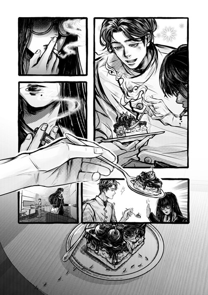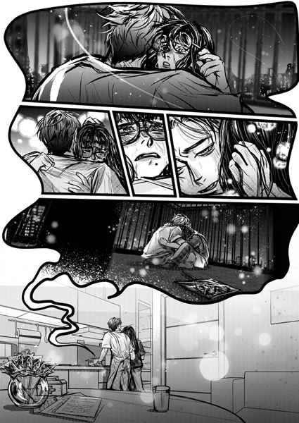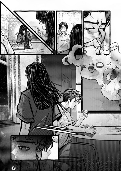 “My favorite part of the story is the spread page, where I tried to draw a broken heart between the pages. I truly wanted to show the heartache both of my characters are going through, but can't convey their feelings. Therefore, it shows whats boiling inside of them, metaphorically and artistically.”