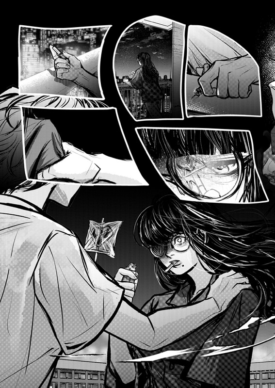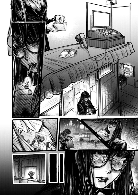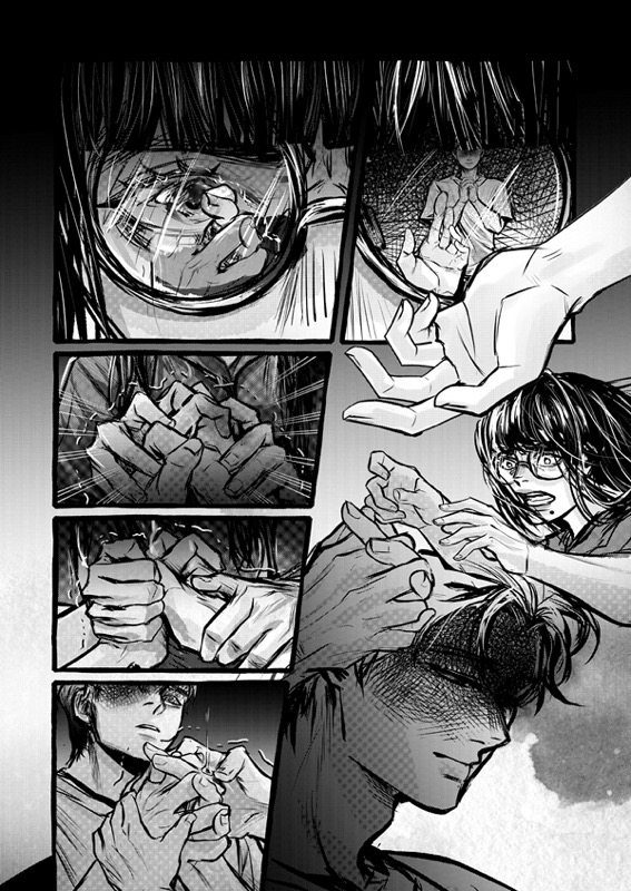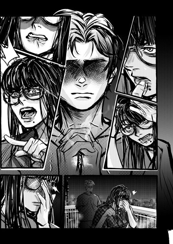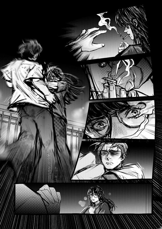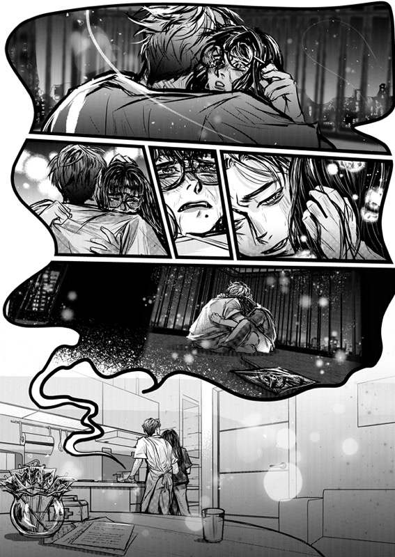 | “My favorite part of the story is the spread page, where I tried to draw a broken heart between the pages. I truly wanted to show the heartache both of my characters are going through, but can't convey their feelings. Therefore, it shows whats boiling inside of them, metaphorically and artistically.” | |