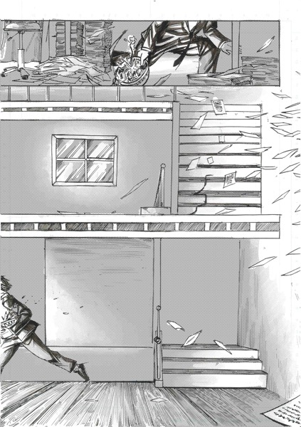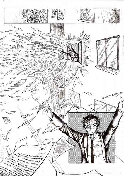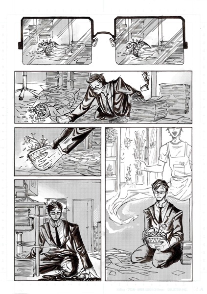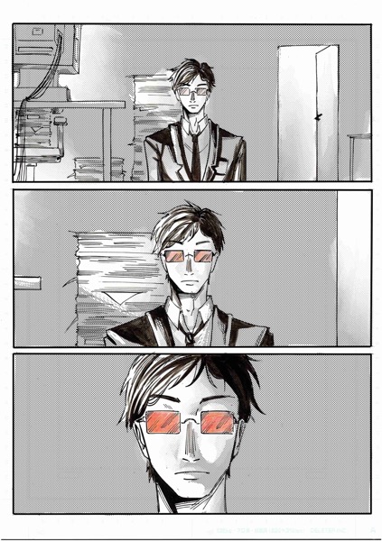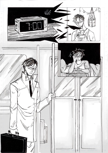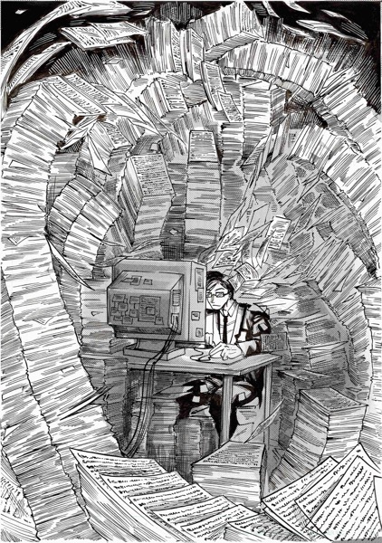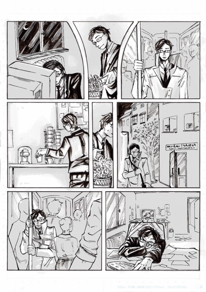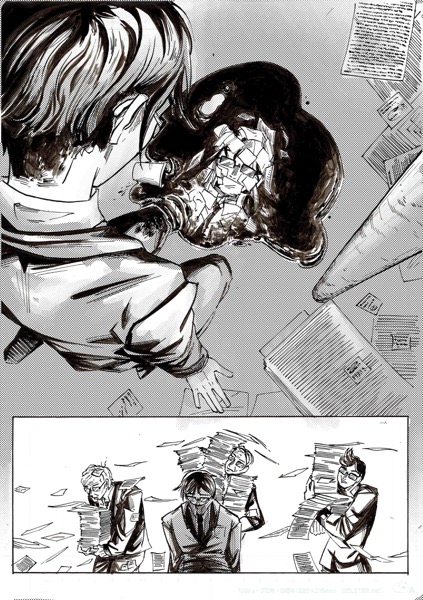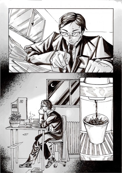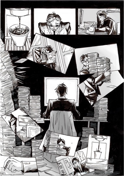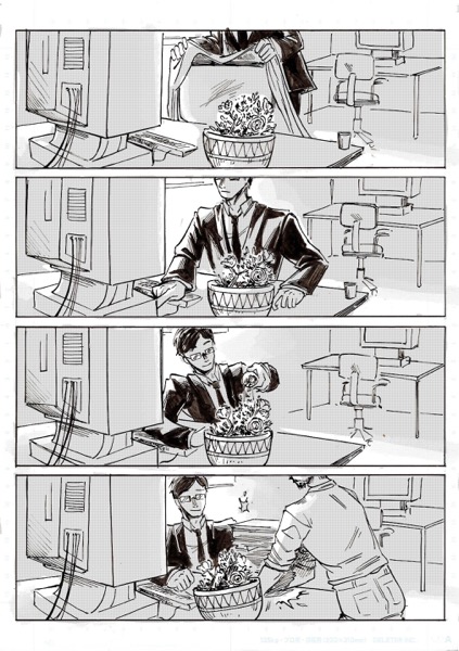| “My favourite par is the moment when the main character look at himself in his coffee. I had this idea wile re-watching Brazil, by Terry Gilliam. In the movie, there's someone who is covered by papers, litterally eaten by administration!” | |