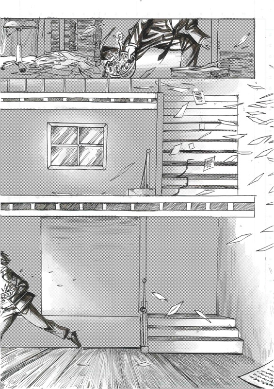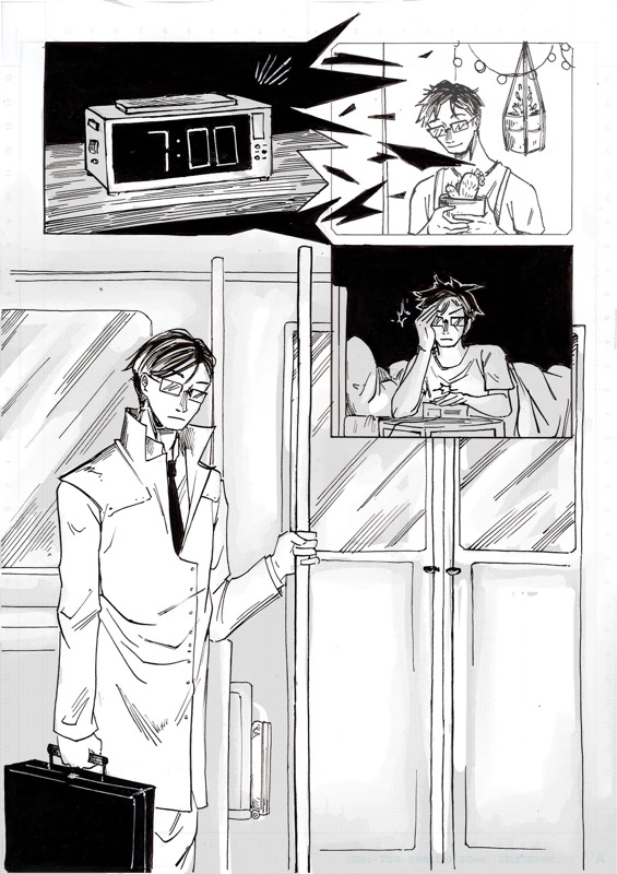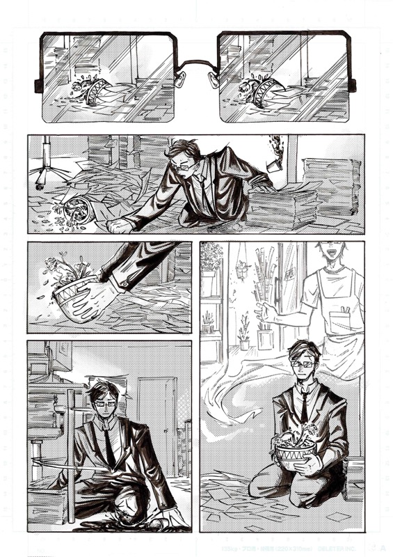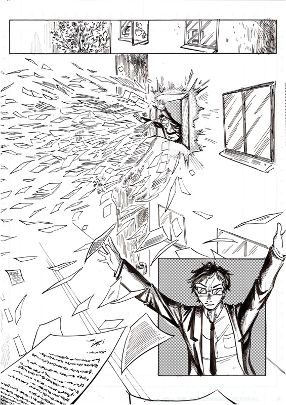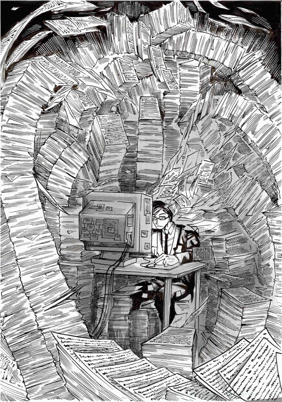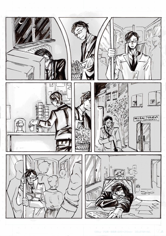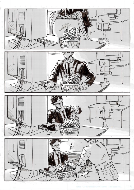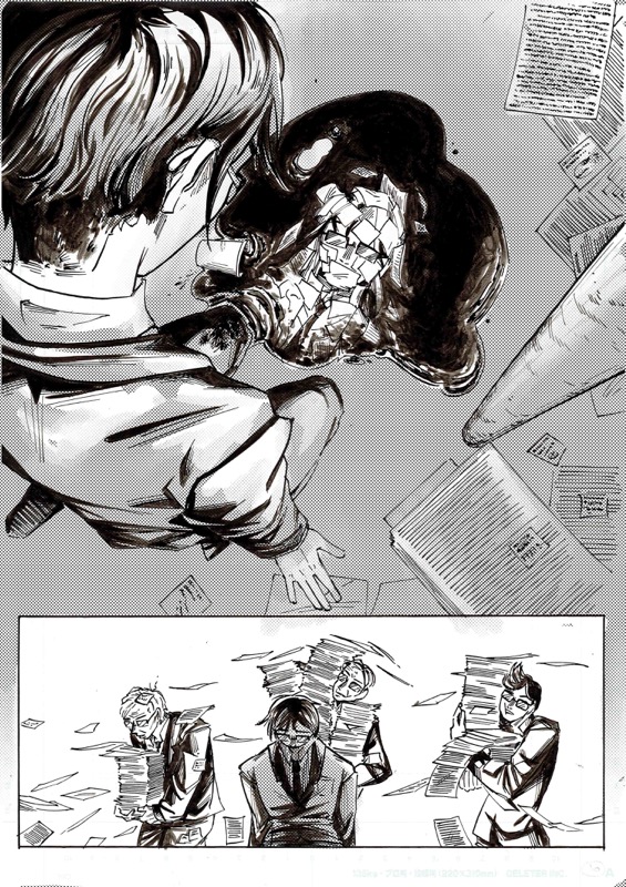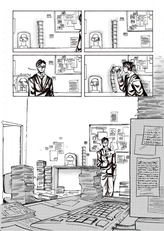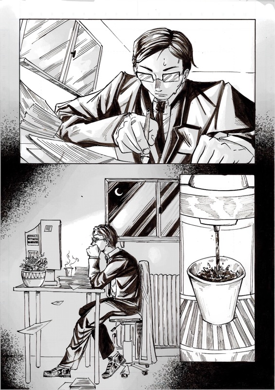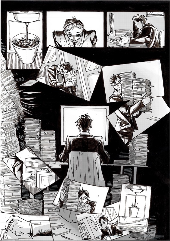 “My favourite par is the moment when the main character look at himself in his coffee. I had this idea wile re-watching Brazil, by Terry Gilliam. In the movie, there's someone who is covered by papers, litterally eaten by administration!”