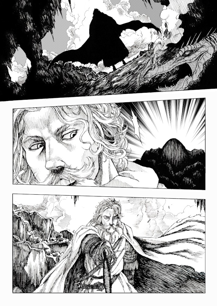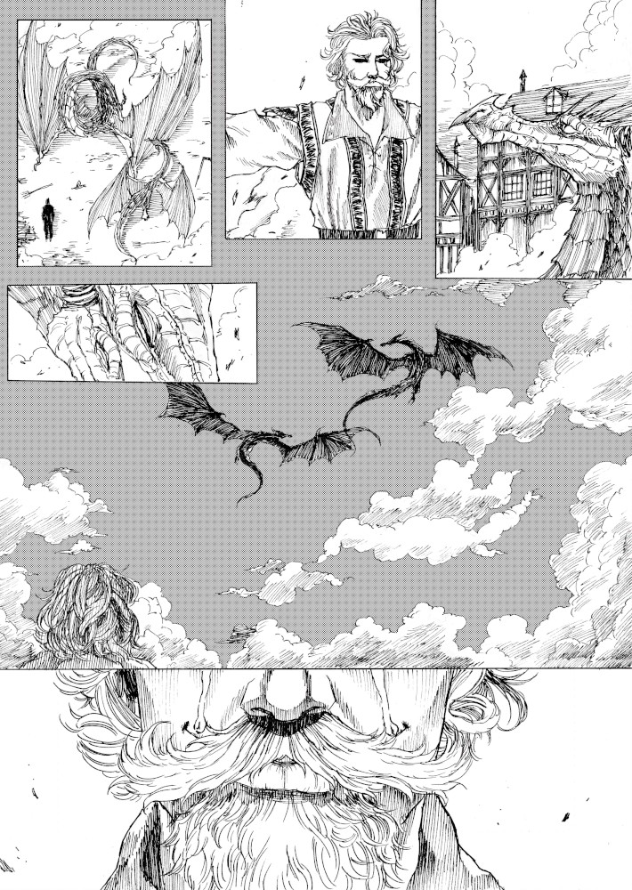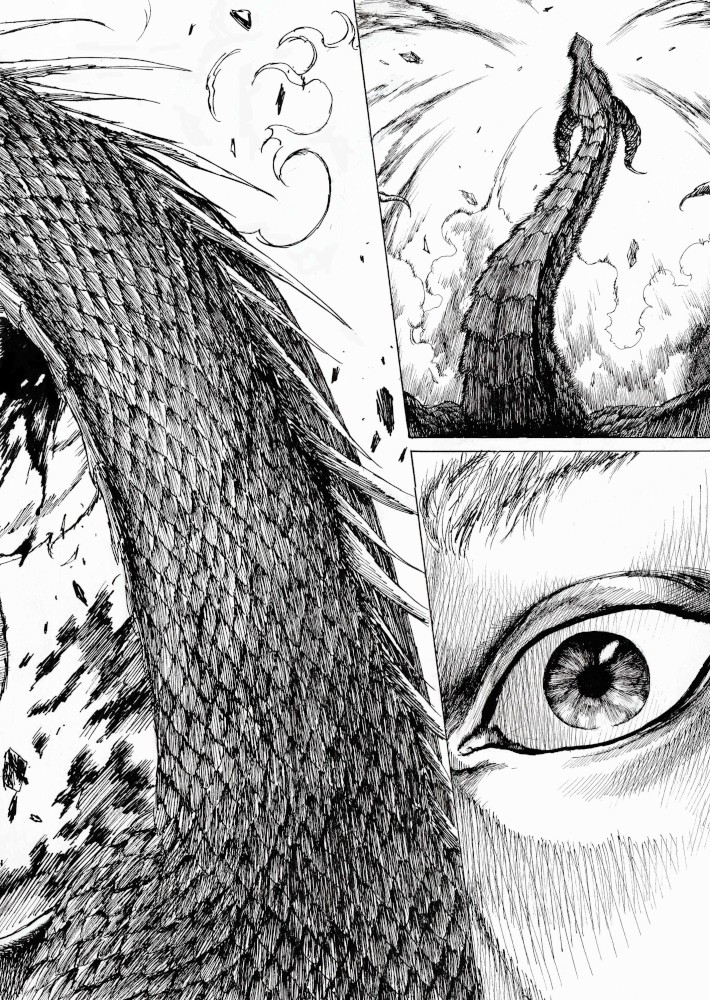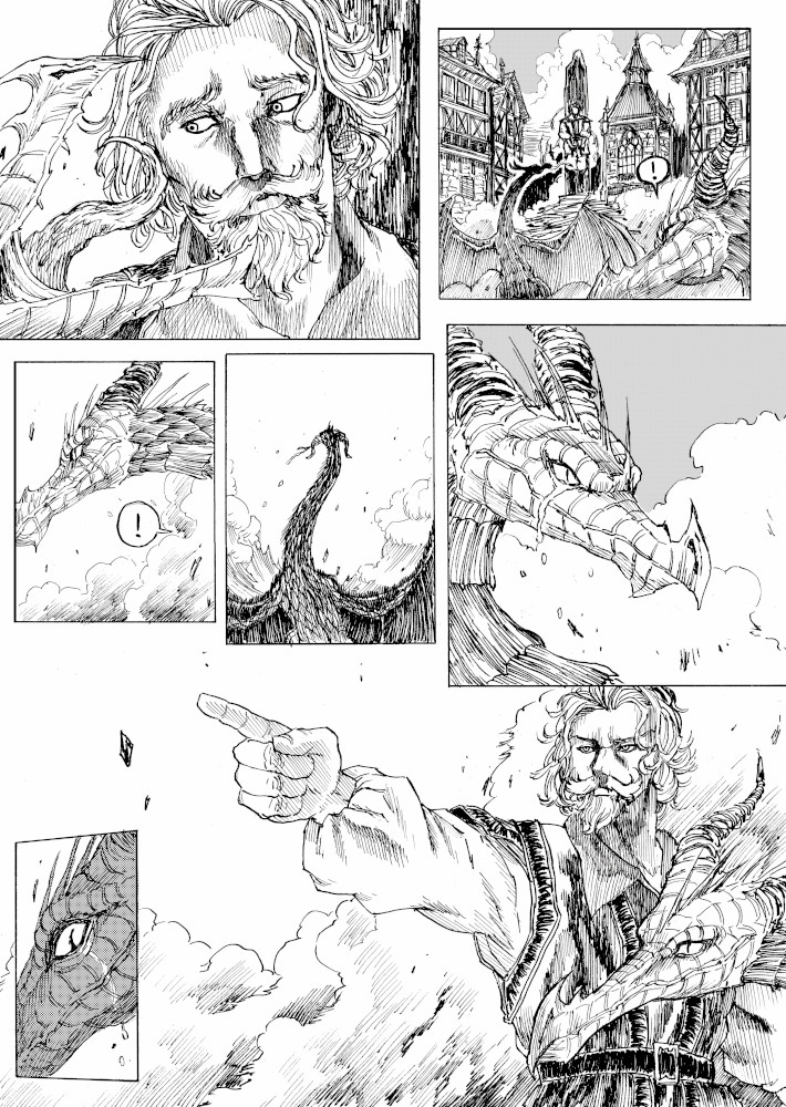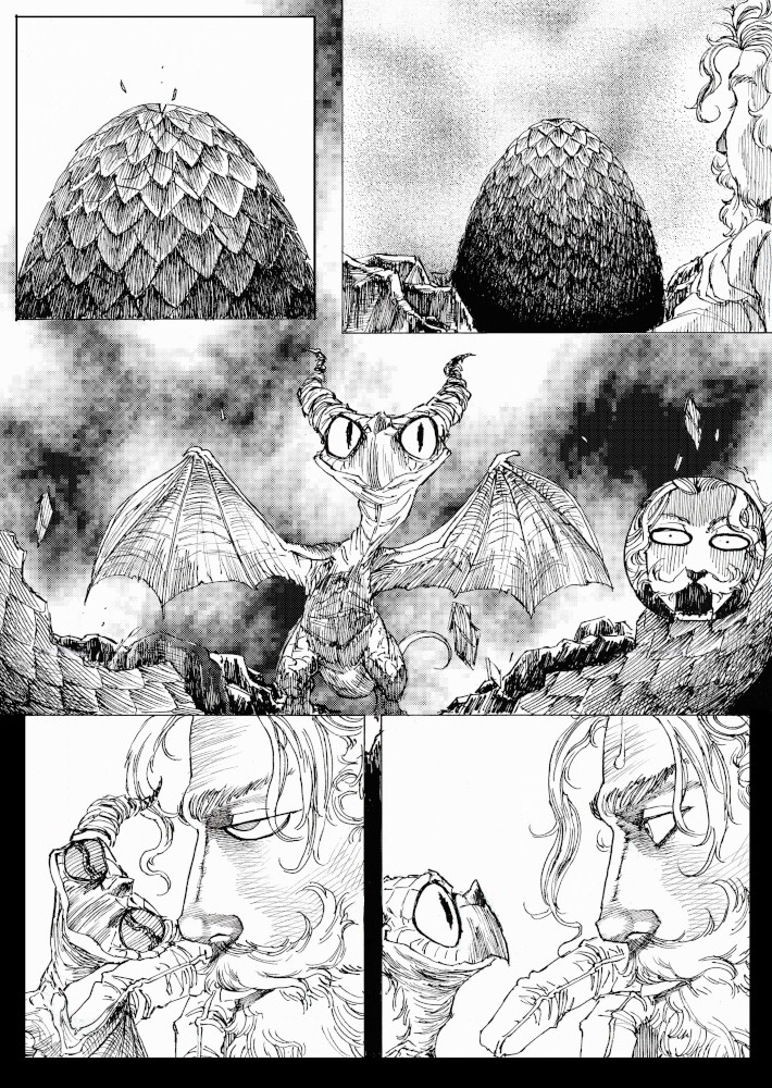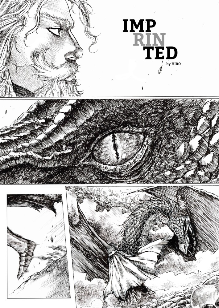 | “I'll be honest, this wasn't easy to complete. Not only because of the handwork itself, but also because of the expiring date: I discovered the contest only 15 days before it ended, and I had never inked a manga page before. But the idea of Silent Audition sounded so great to me that i understood I had to make my best and finish it before I ran out of time. I wanted to fill it with fantasy and historical elements, a big package of seinen-style action scenes, but also I didn't want to draw the usual story about a puppy and his mother, no. I wanted a DRAGON to be the protagonist. I took the pencil, wrote for a night, and the result was : Imprinted. I hope you will enjoy it. P.S: If you are not tired of reading this incredibly long comment, I wanted to make you know the story is called "imprinted" from "imprinting", the psychological phenomenon that makes some animals (ex. ducks) think the first thing they see when they're born is their mother. Please forgive all the grammatical mistakes in this comment.” | |