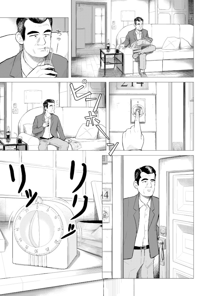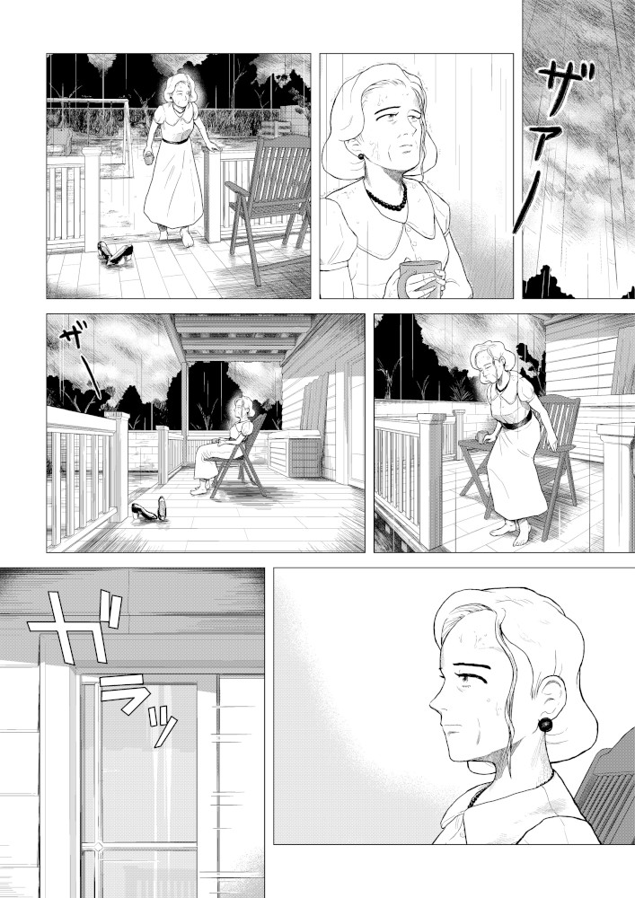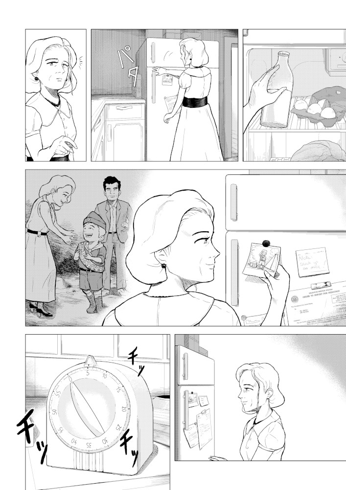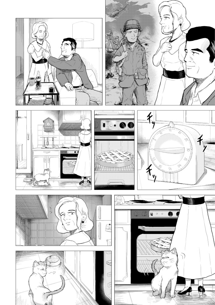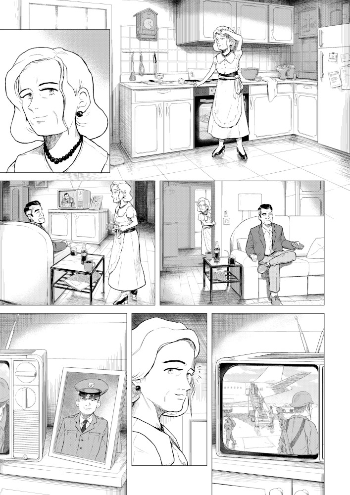 | “What I tried was that I aimed for a buildup towards the final two pages of this piece, using different types of imagery to create a mood where something is about happen. Also worrying about your child, in this case specifically in times of war, is (unfortunately) an universal theme, I think.” | |
