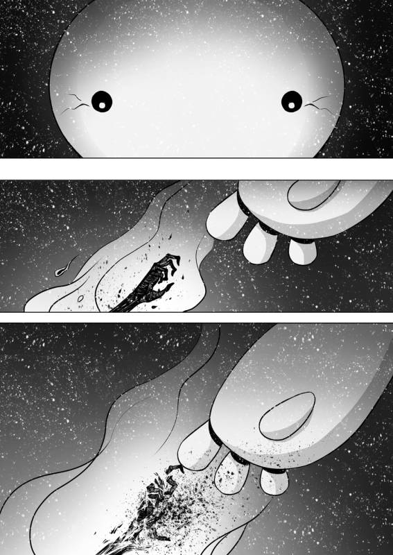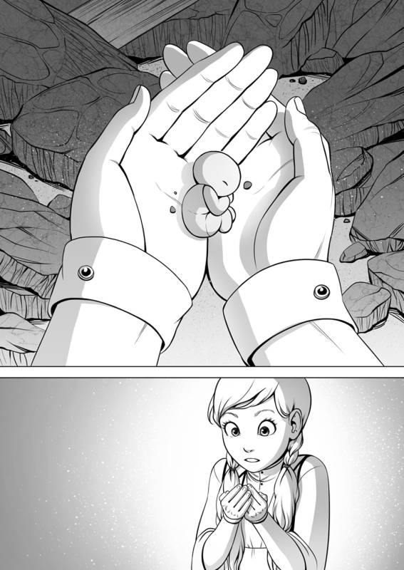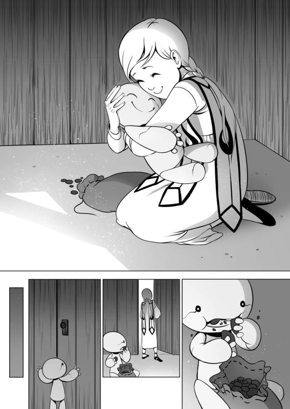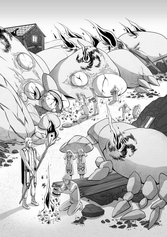 | “In the aftermath of a rock golem rampage, while the people set about burning rock golem offspring, a little girl holds a tiny baby rock golem in her hands.” | |
