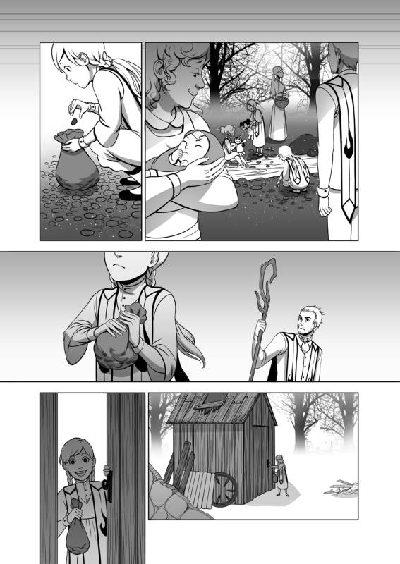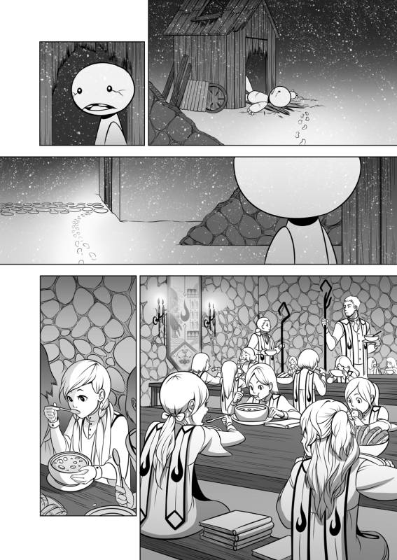| “I tried to put information in the background, but I'm not sure if it came across in the end. For example, how the design of the cloth they wear over their uniforms is a simplified version of the banners they hang in the dining hall, which depicts their struggle with the rock golems from the mountains. And how the adult rock golem in the beginning was in the middle of eating the rock walls of houses, as there were bits in it's mouth and under it's loosened fist. Whether or not it came across, I hope people enjoy reading it!” | |