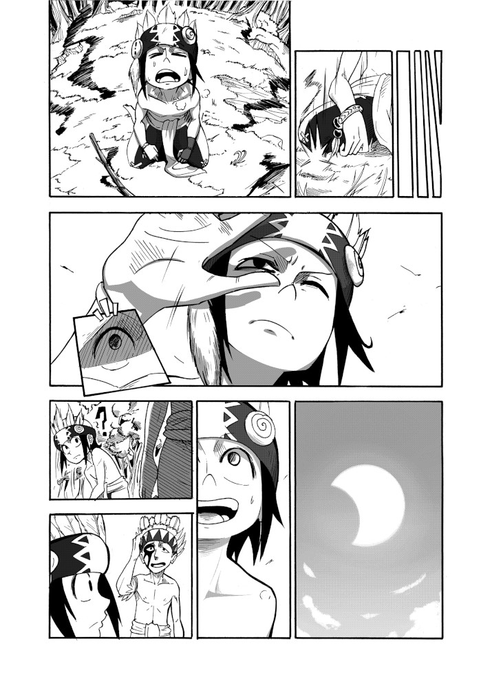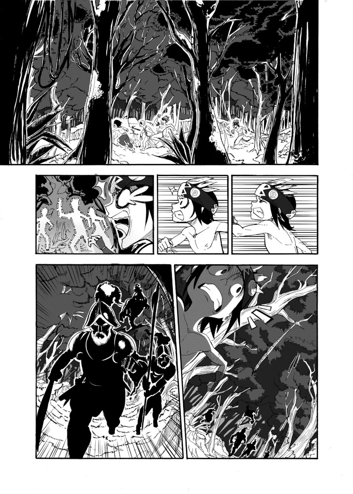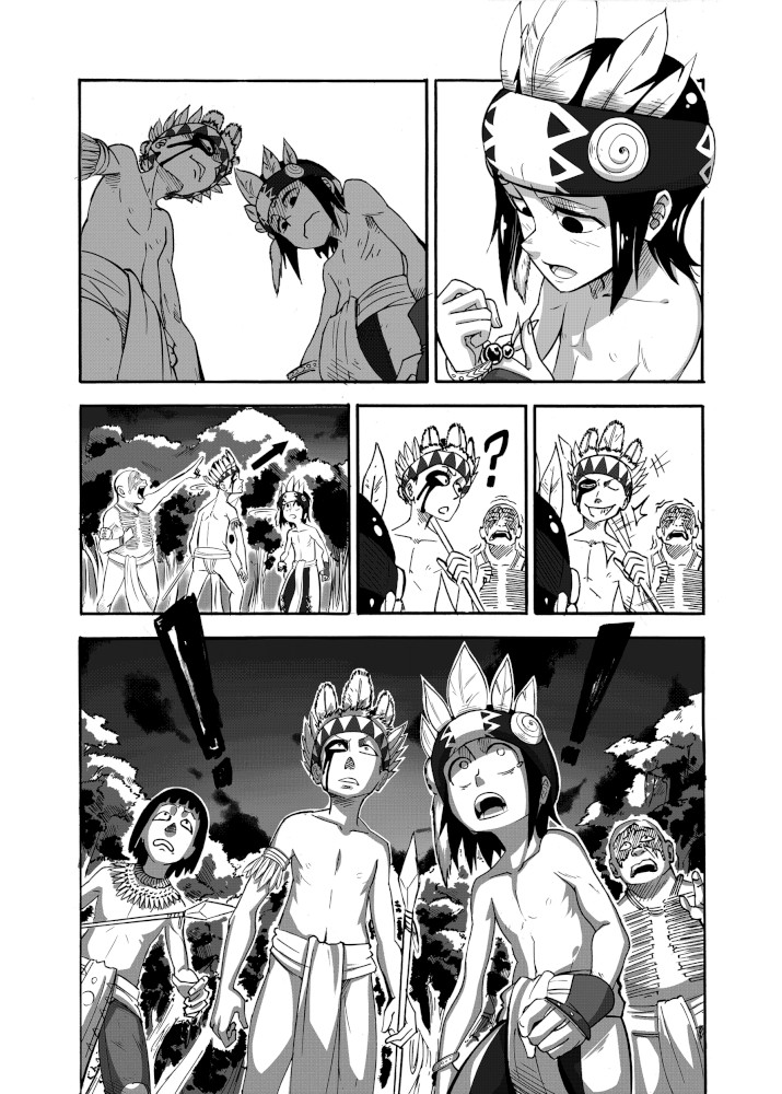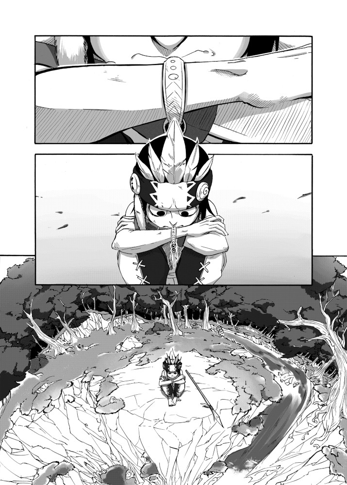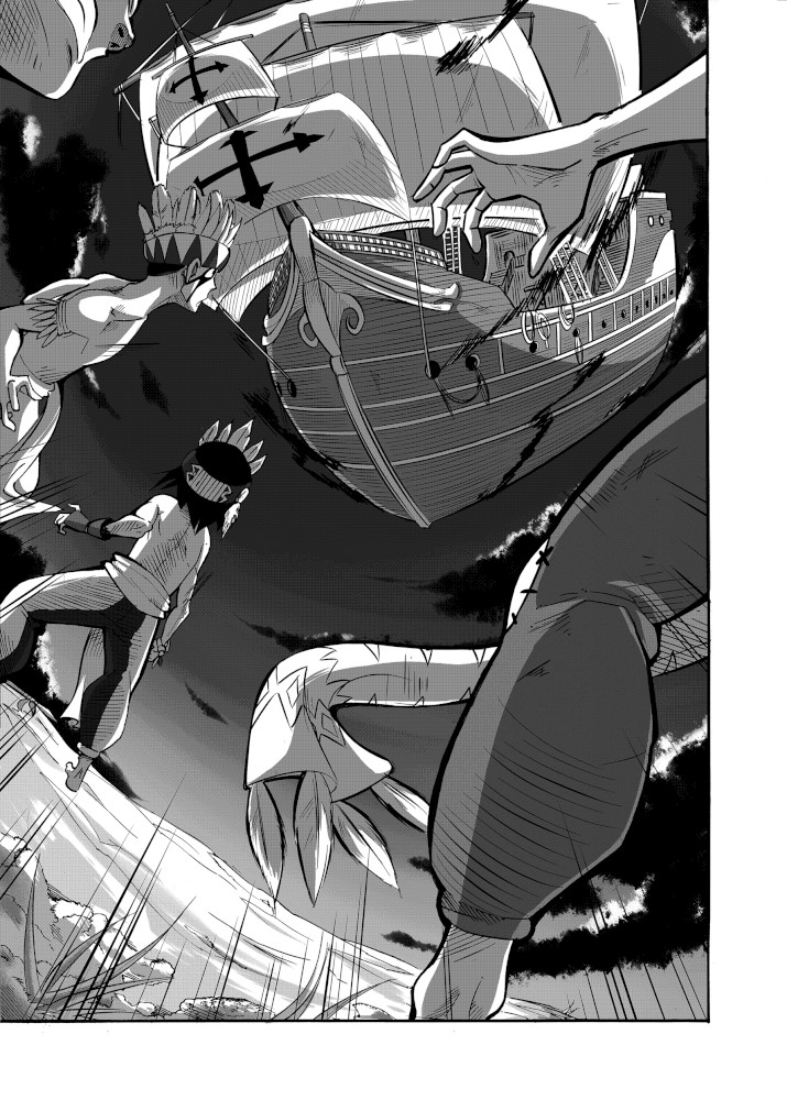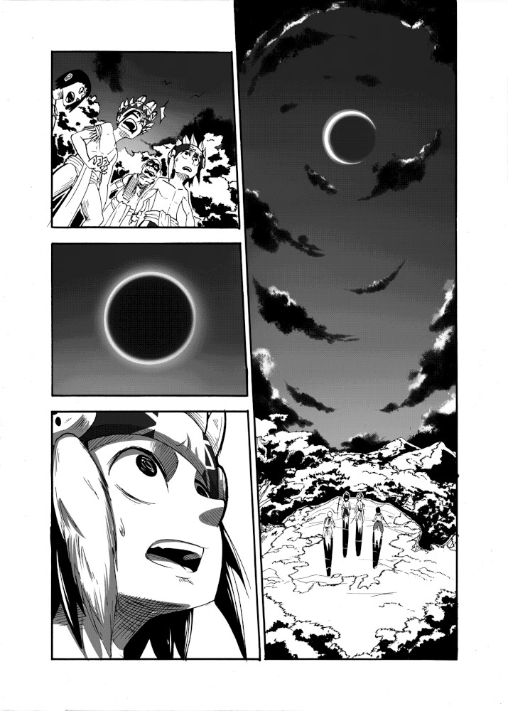 | “He wanted to show that indigenous children thought to see the eclipse, at that time people were afraid of the unknown, that's why I wanted to express that feeling with a huge ship falling from the sky.” | |