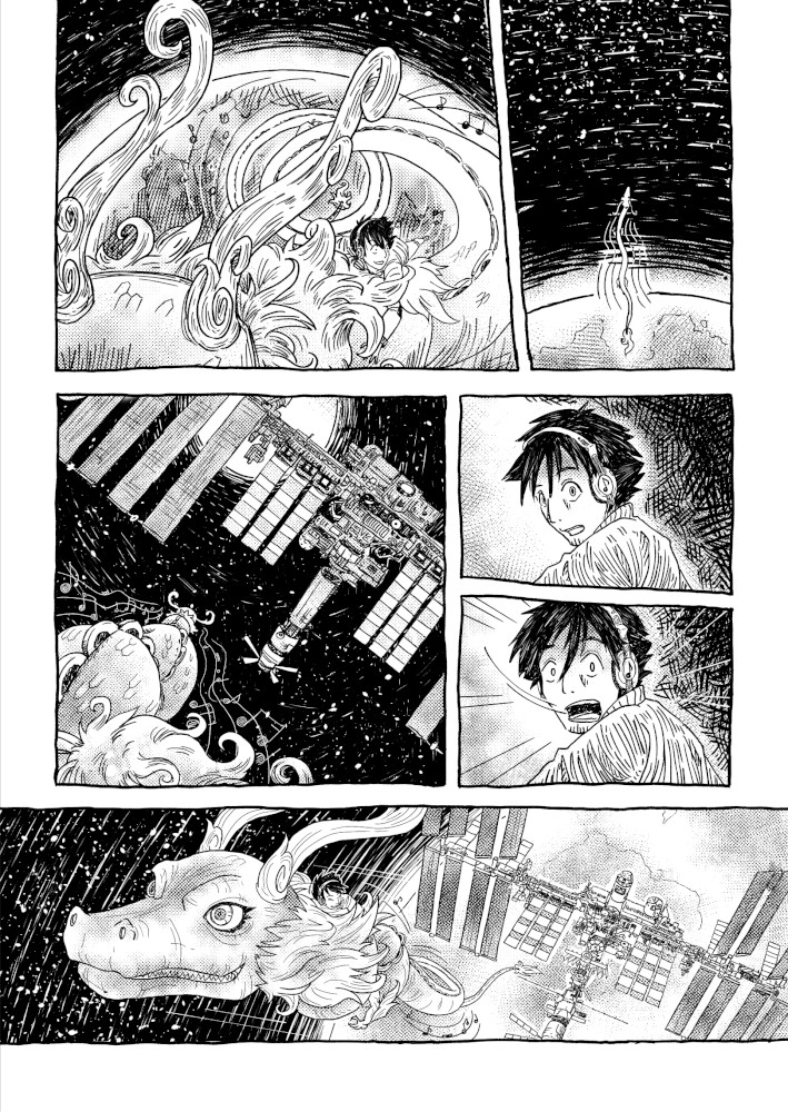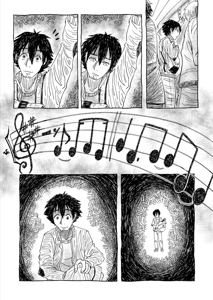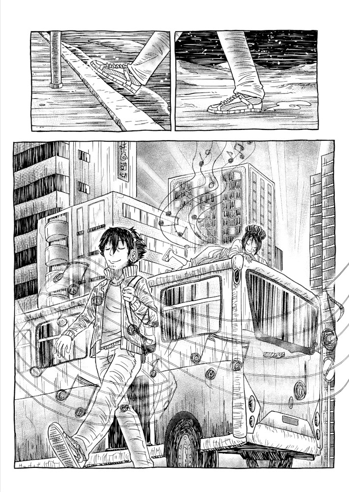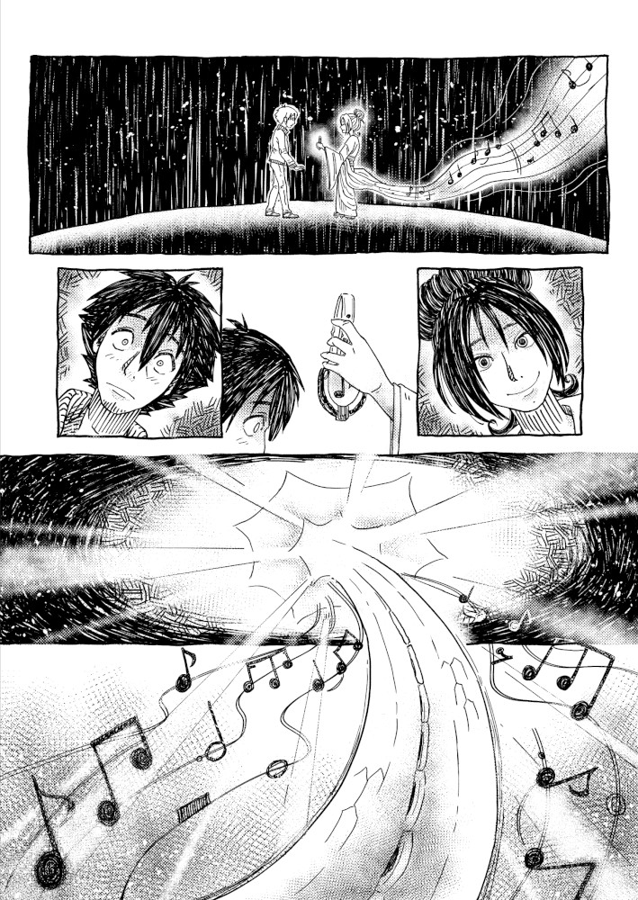 | “We wanted to demonstrate the importance music has in our lives through a fantastical view, sometimes being literally a gift saving us. Although the reasons behind the story are quite personal to us, we believe music is a universal language and anyone around the world can relate to, making this a perfect theme for a silent manga.” | |
