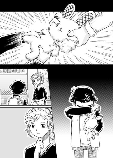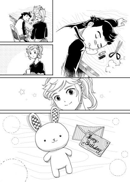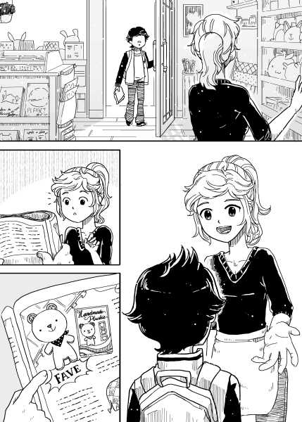| “There are two kind of gift that was shown in this story. The first was when the boy made the plushie for his little sister. The second was when the shopkeeper help the boy fixed the damaged plushie. Gift can take many form to make people smile.” | |