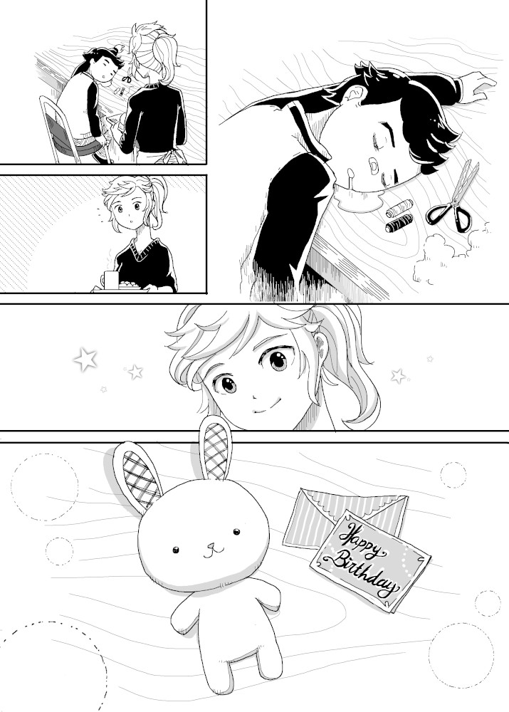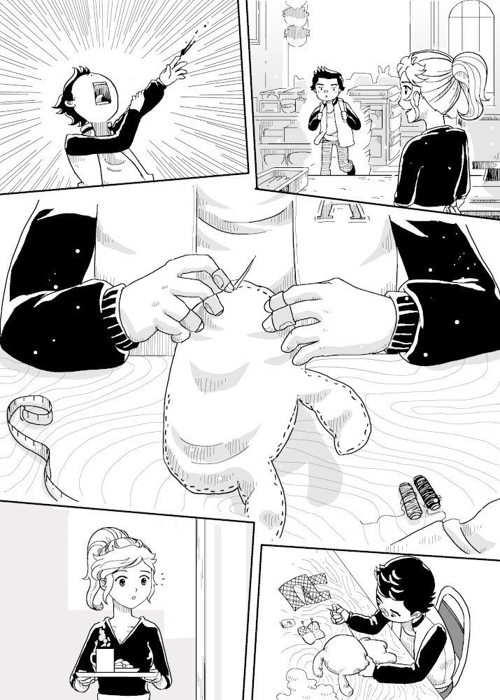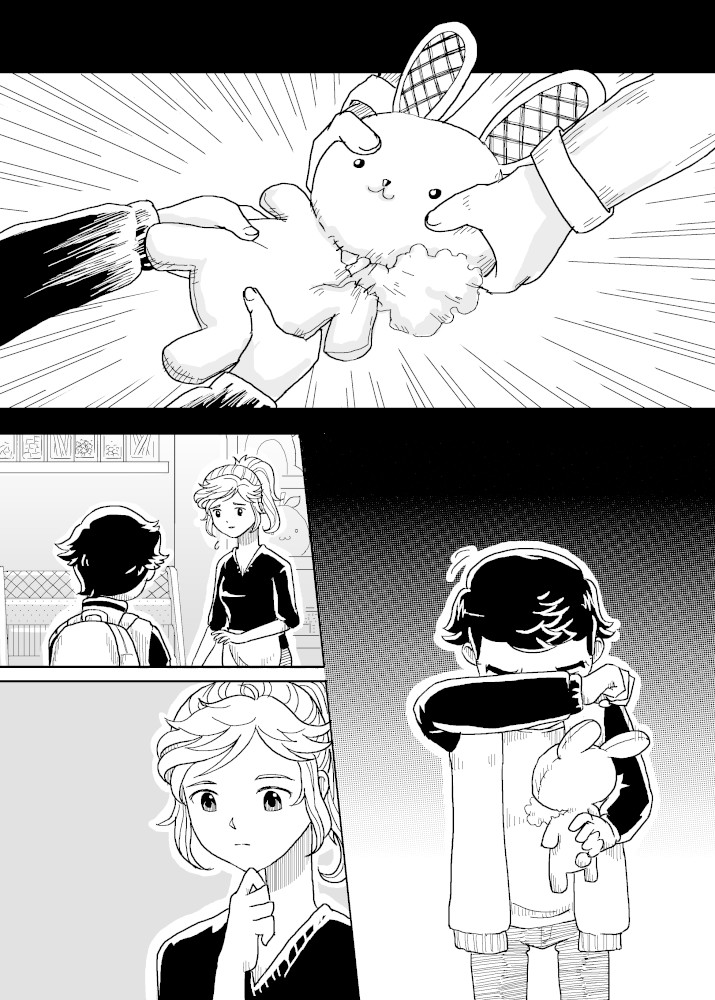 | “There are two kind of gift that was shown in this story. The first was when the boy made the plushie for his little sister. The second was when the shopkeeper help the boy fixed the damaged plushie. Gift can take many form to make people smile.” | |