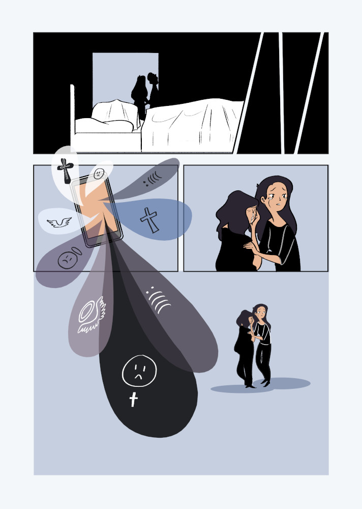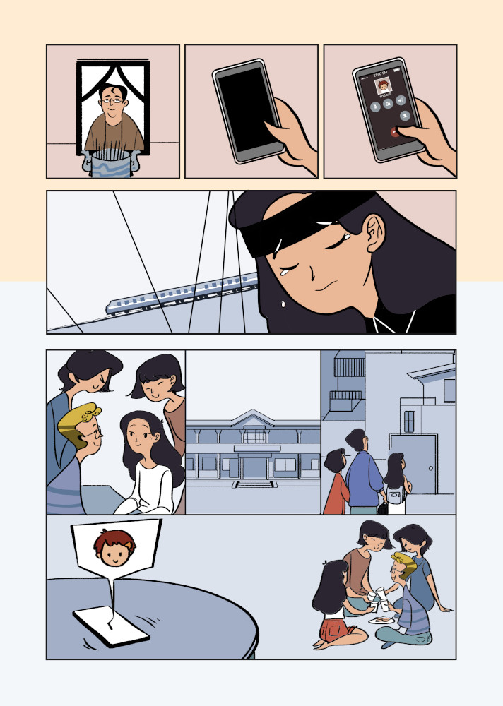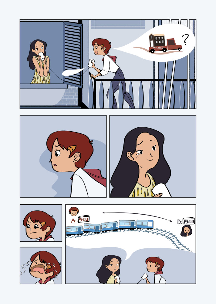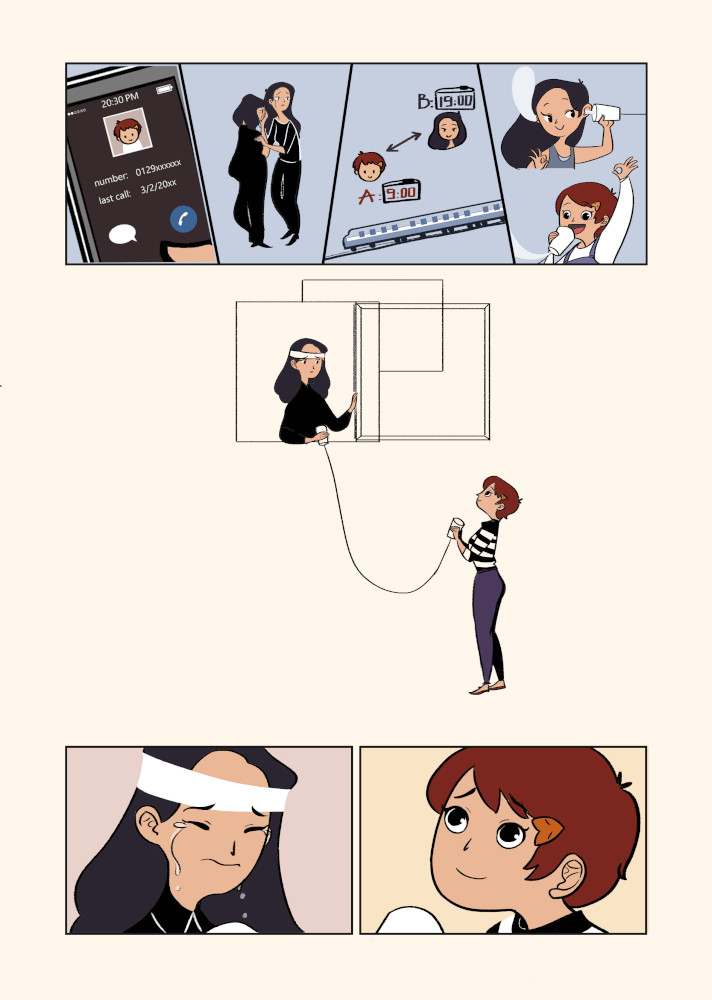| “when the red hair girl(A) come from a far away place to see her friend(B), after she knows about B father’s death although they did not contact to each other after a very long time” | |
