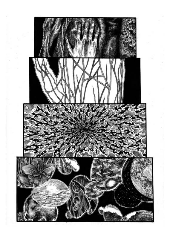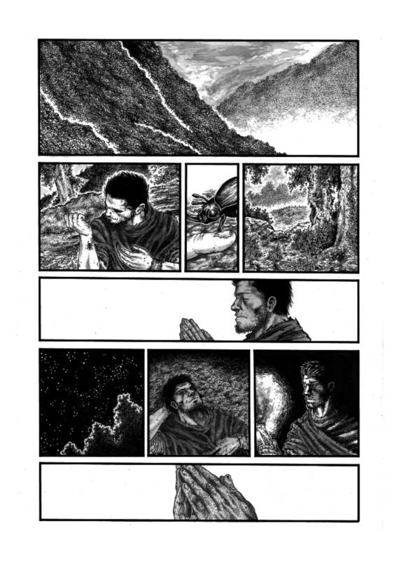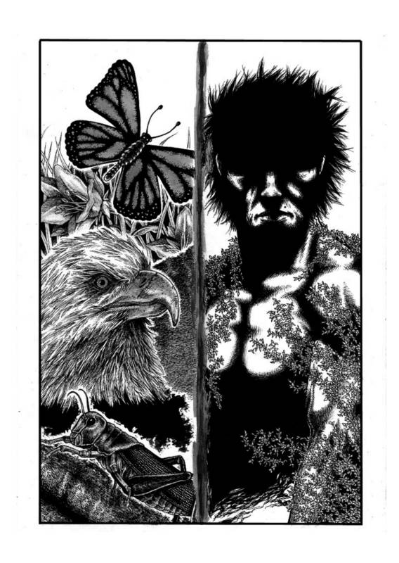 | “This manga asked me almost 2 working months Pantheistic and Indian ideas incited me to draw about this. The nature is very important for me, i think she hel a man a lot for his spiritual development.” | |