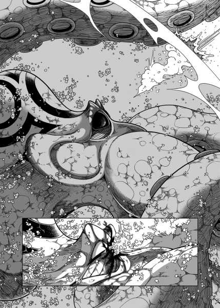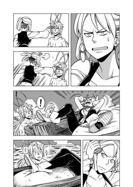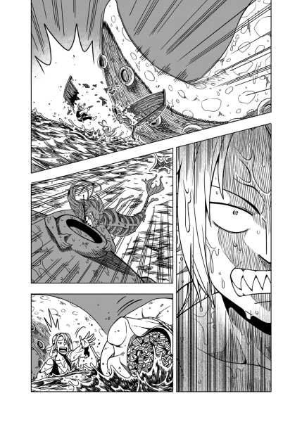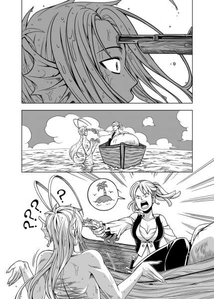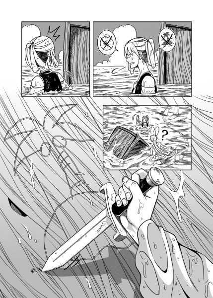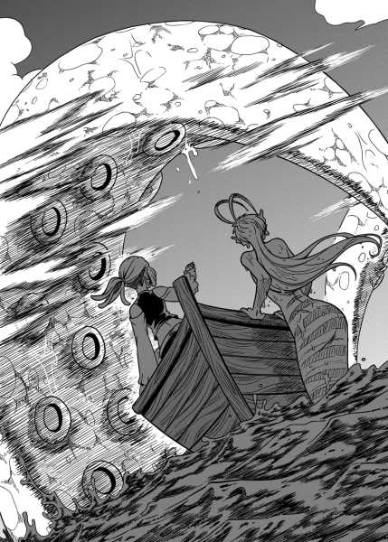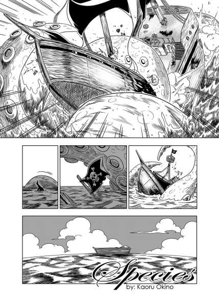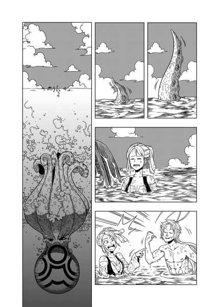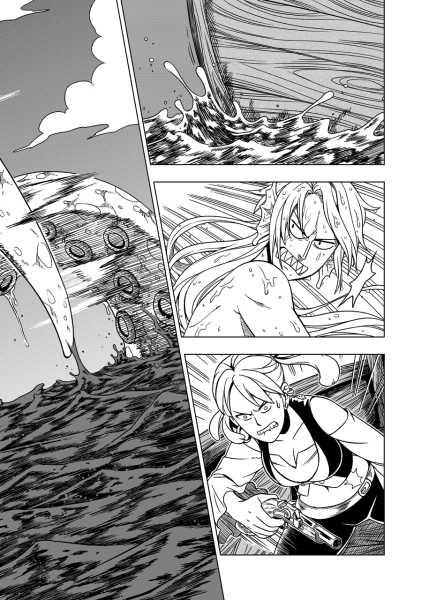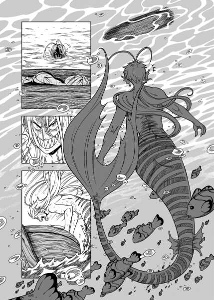 | “(Page 08-09) I liked the part when the woman pirate is worried about her treasure, but the merman who was protecting her is hit, and then she gets angry because without her noticing, that merman becomes her friend. (Page 12) I just loved to draw this part.” | |