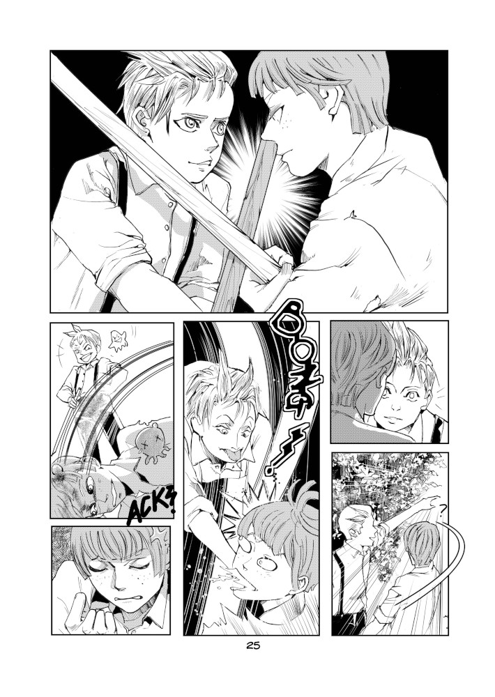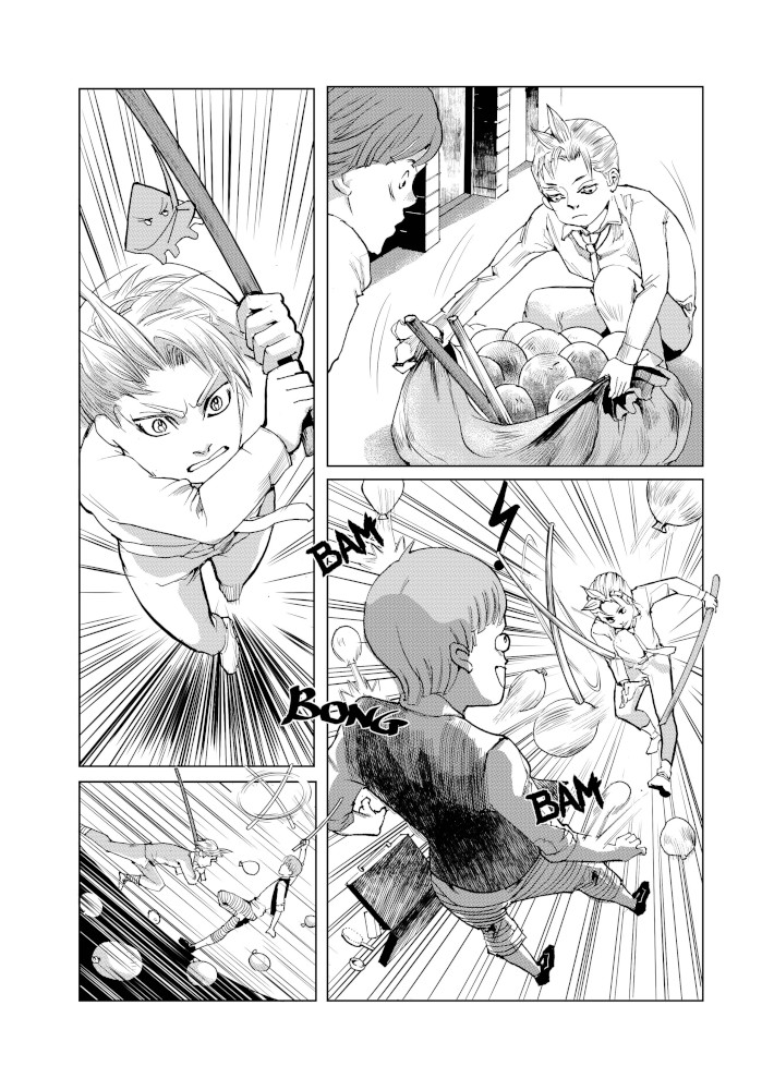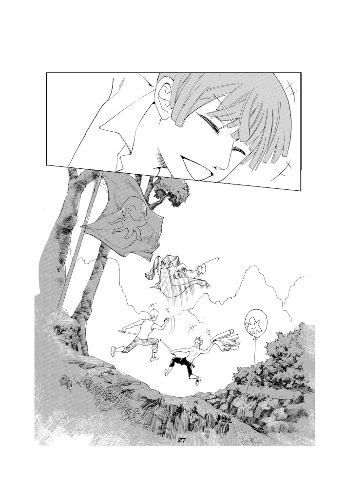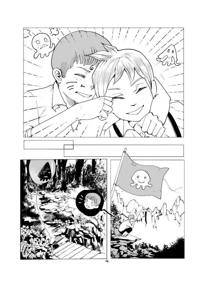 | “The part which I enjoyed drawing the most is the part in which Squid did try his best to look for Octopus on his own and recommunicate with his friend even he's clumsy with word, trembling with anger and fear and had to utilize the sword instead.” | |