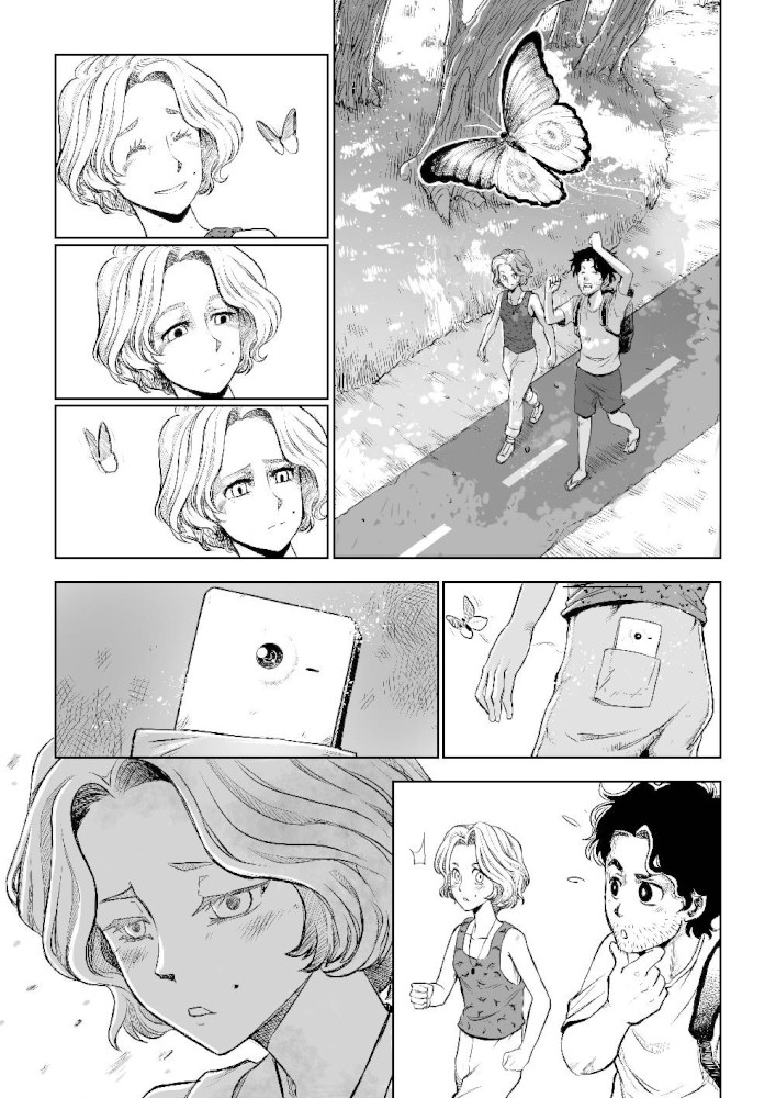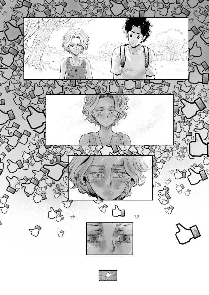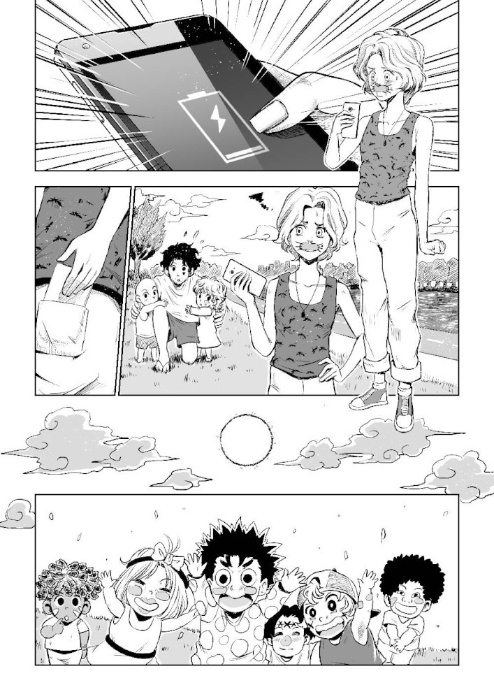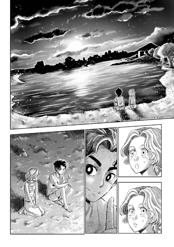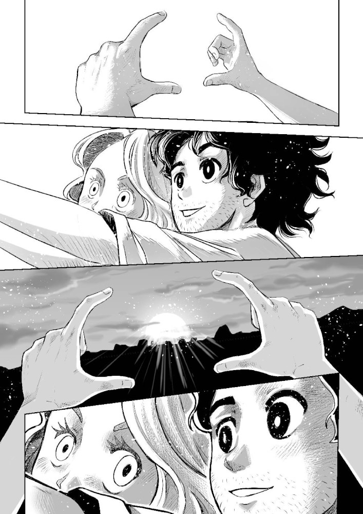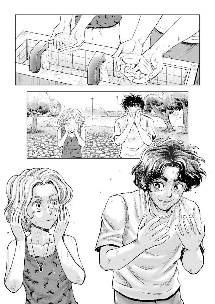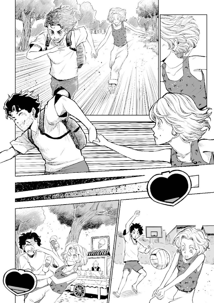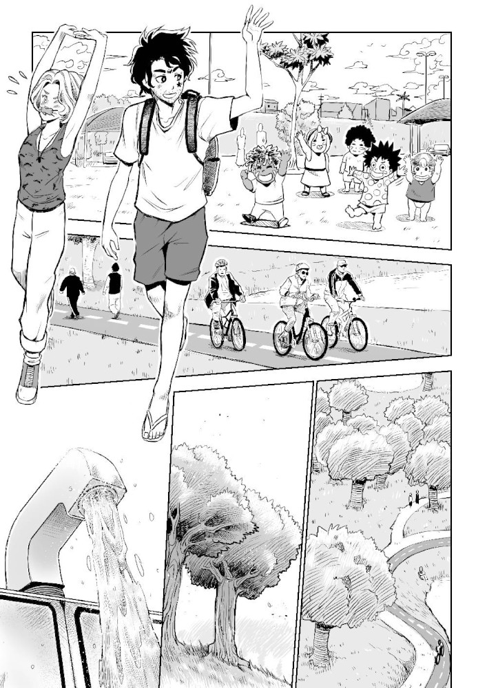 | “I feel very grateful for the day in the park that gave me inspiration for this manga. That sunset was so beautiful that I needed to register the event in a story. In the real fact, the cell battery also ended and we had to take mental pictures. I feel very grateful for the pleasant company Tábata girl who shared this moment with me. I thought I should find something that I really believed to put on silent manga. So I wrote about the friendship between a boy and a girl, and how much we can learn when we look at the real world without the eyes of technology. The contest required the communication tool as a theme, but I wanted to talk about the absence of this tool.” | |