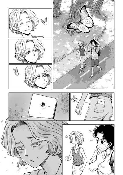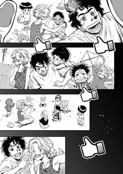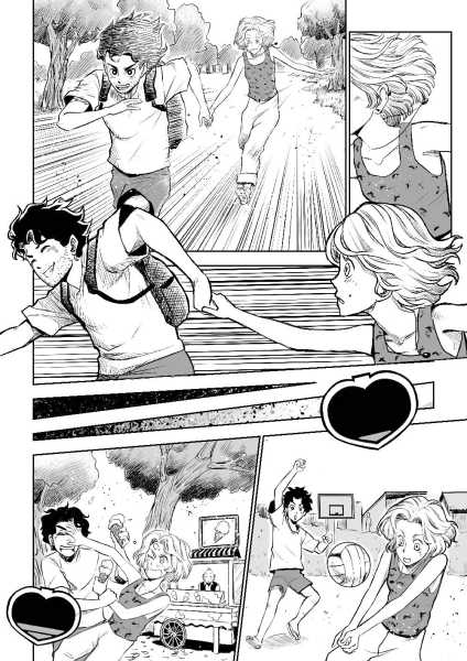 | “I feel very grateful for the day in the park that gave me inspiration for this manga. That sunset was so beautiful that I needed to register the event in a story. In the real fact, the cell battery also ended and we had to take mental pictures. I feel very grateful for the pleasant company Tábata girl who shared this moment with me. I thought I should find something that I really believed to put on silent manga. So I wrote about the friendship between a boy and a girl, and how much we can learn when we look at the real world without the eyes of technology. The contest required the communication tool as a theme, but I wanted to talk about the absence of this tool.” | |
