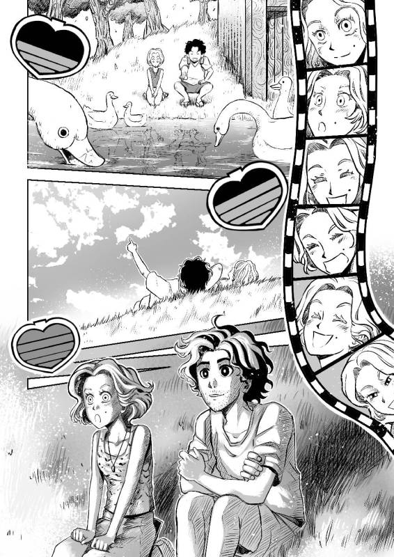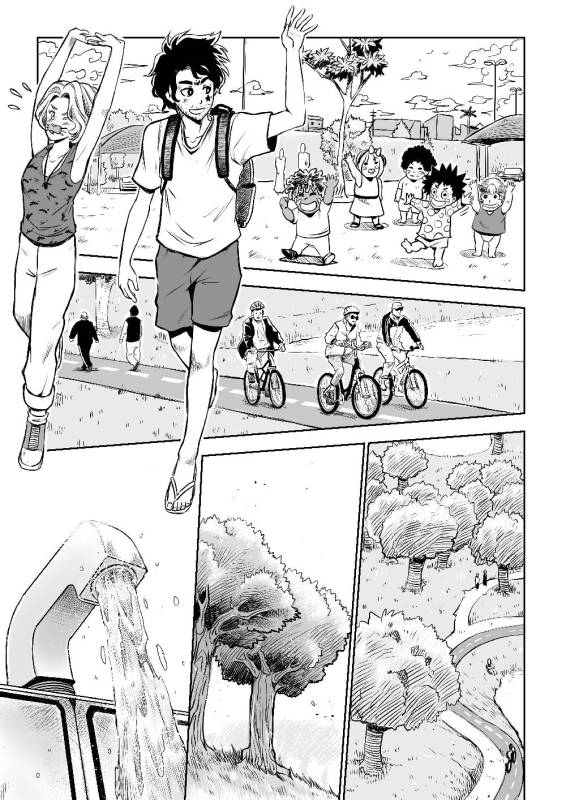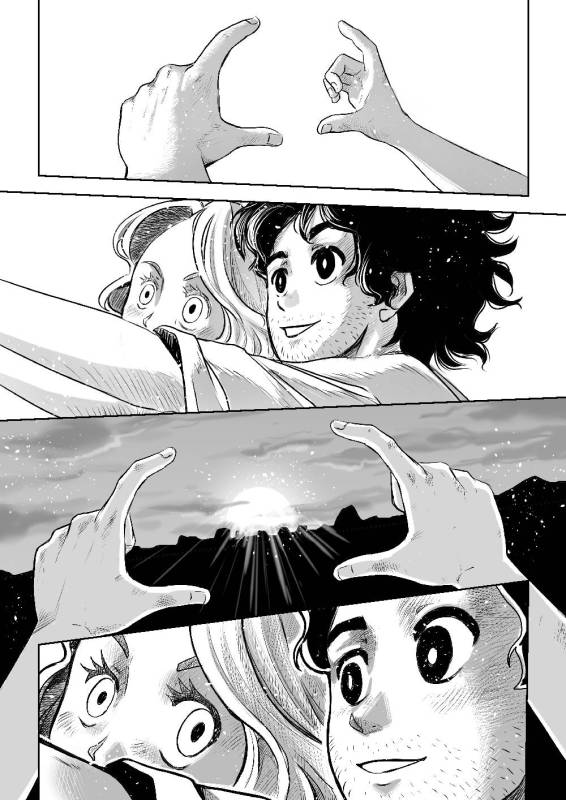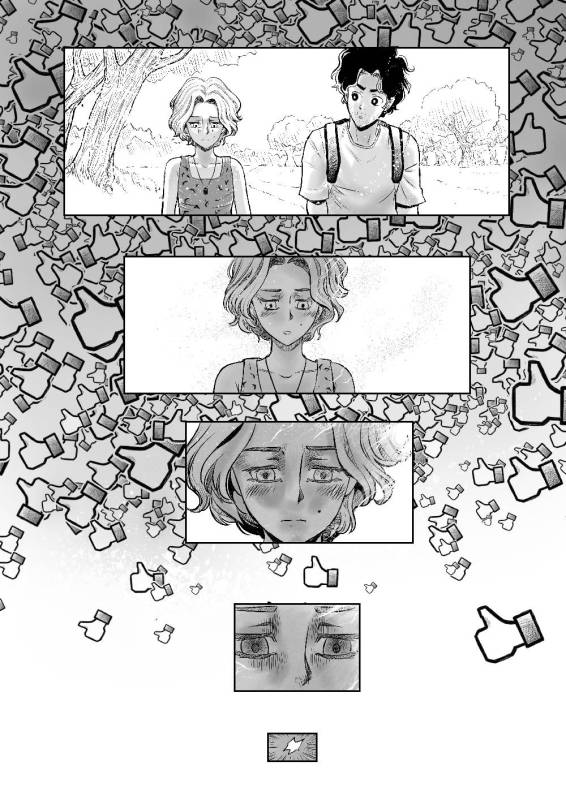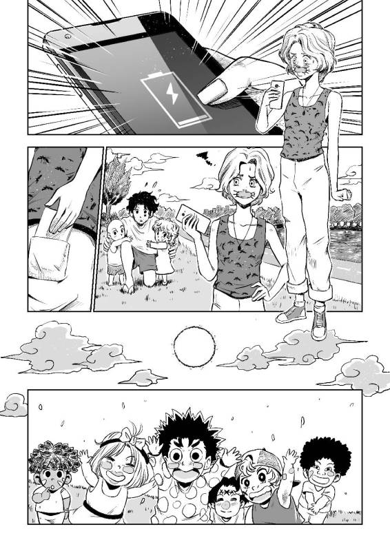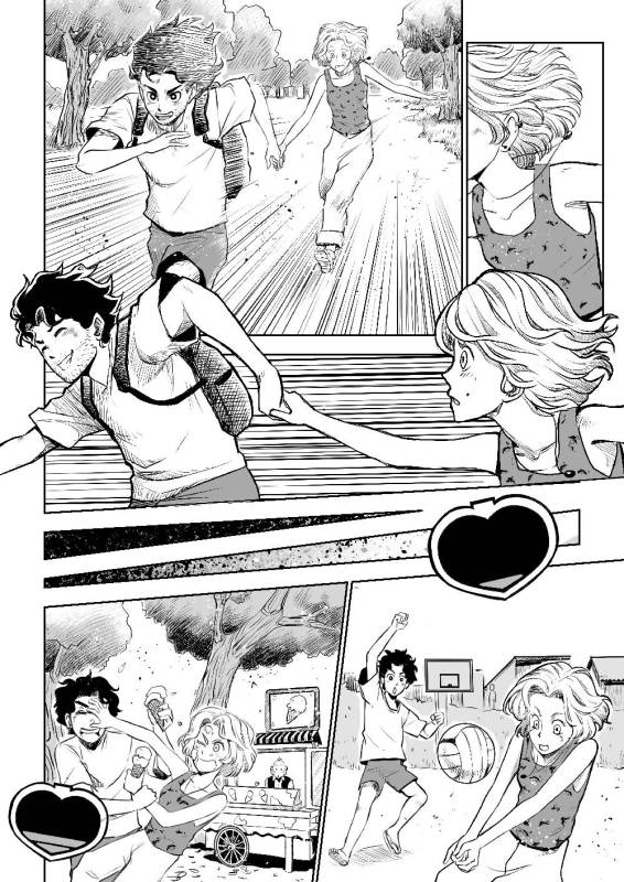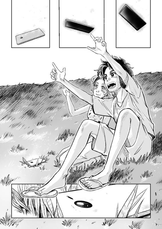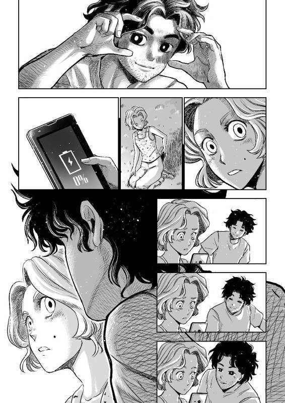 | “I feel very grateful for the day in the park that gave me inspiration for this manga. That sunset was so beautiful that I needed to register the event in a story. In the real fact, the cell battery also ended and we had to take mental pictures. I feel very grateful for the pleasant company Tábata girl who shared this moment with me. I thought I should find something that I really believed to put on silent manga. So I wrote about the friendship between a boy and a girl, and how much we can learn when we look at the real world without the eyes of technology. The contest required the communication tool as a theme, but I wanted to talk about the absence of this tool.” | |