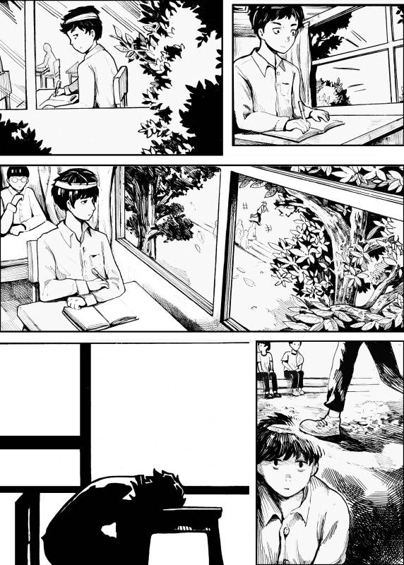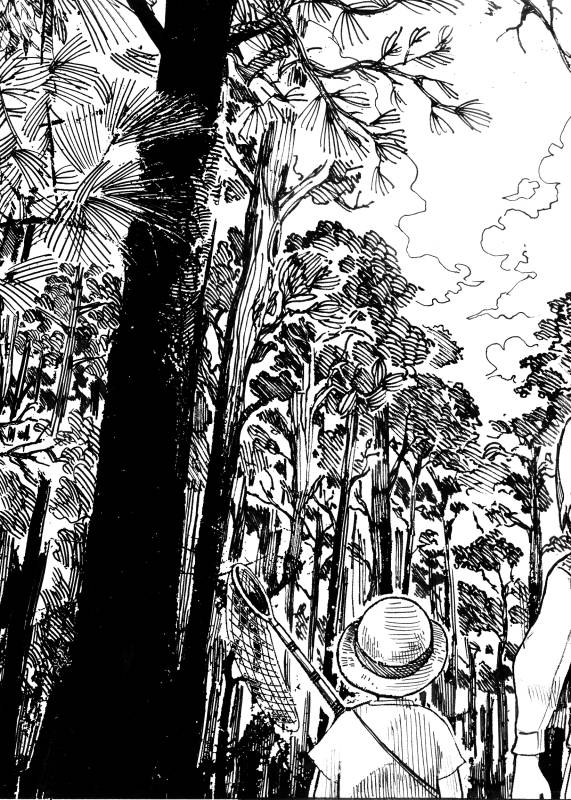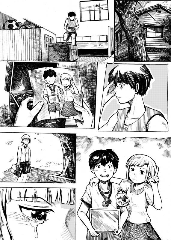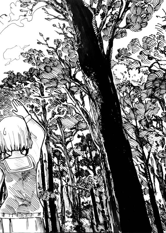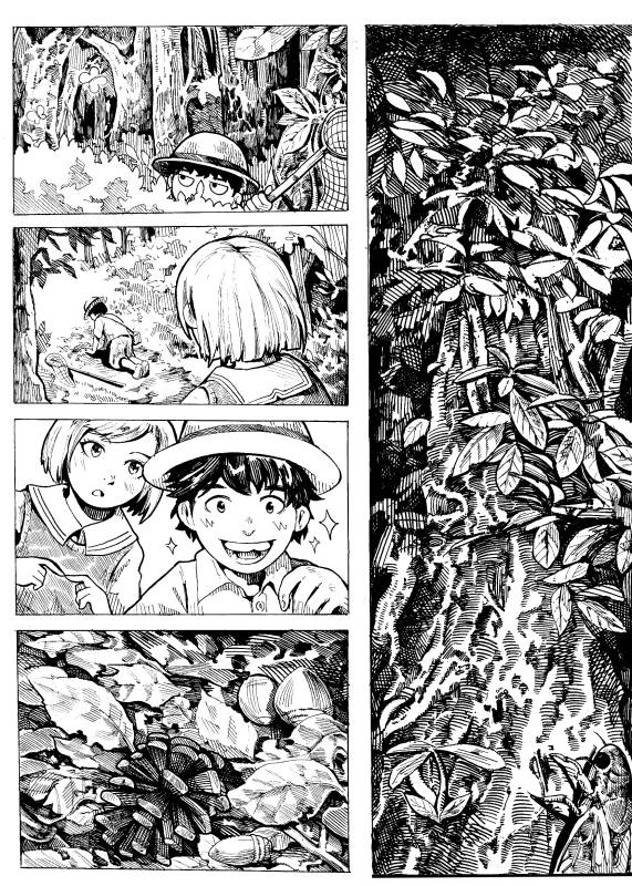 “When I was a child, I usually visited grandma hometown ... Near grandma house, it have a huge pine forest ... I often play with neighborhood kids in there, such as playing hide and seek game or fake fight game ... But now the forest was no longer there now, it has been leveled to the foundation for the factories ... so when drawing this story, I would love to the scene that the children go to capture cicadas in the woods ... They reminds me of my childhood and primary forests in the story are the memories of my remaining years of ancient forests”