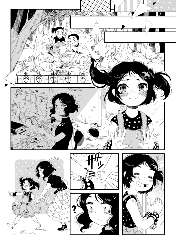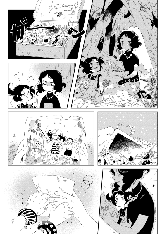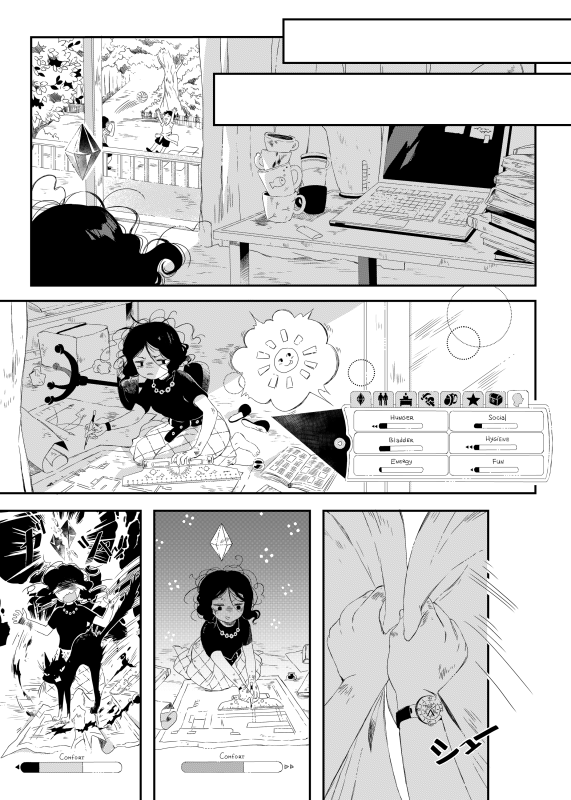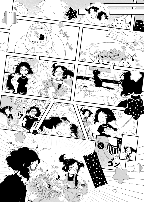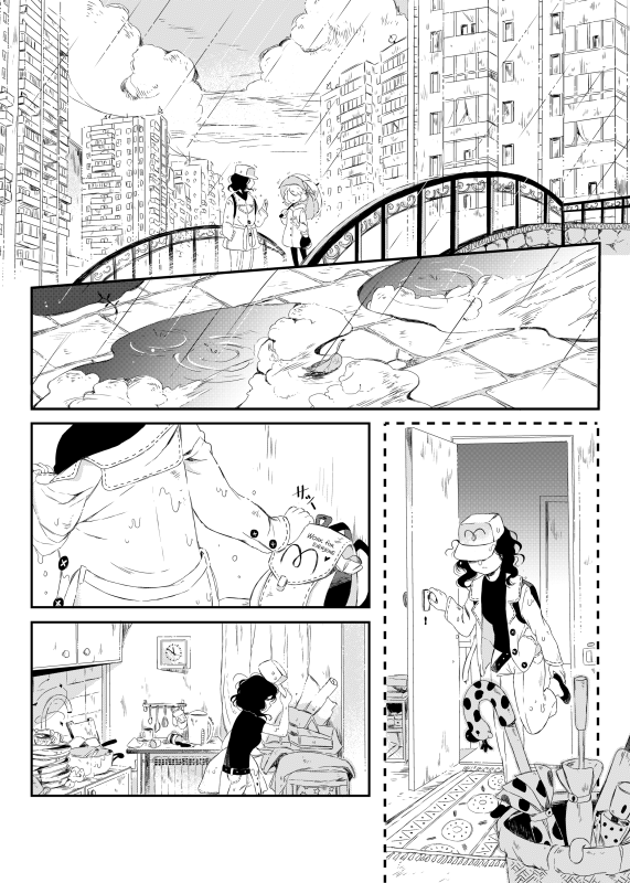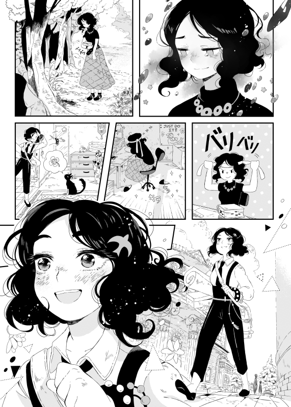 | “We think the whole bunch of expressions on our main heroine's face (we named her Biryuza during the drawing process what means "turquoise" from Russian) is the best part of this story. Her emotions are really different from page to page: starting from nervous and tired up to excited and full of senses ones. Oh, we also had fun drawing moments with the black cat & heroine's ikemen-BF X'DDD” | |