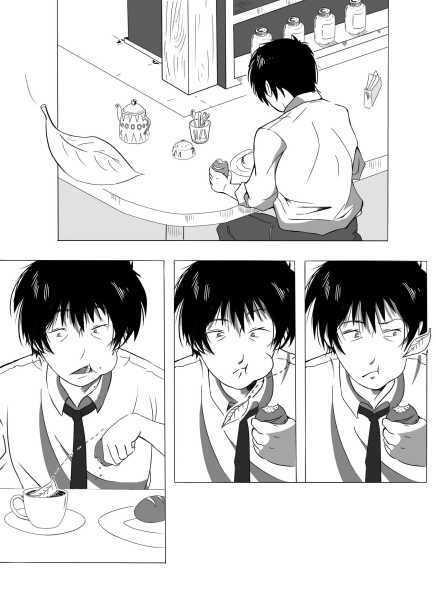 | “Make this manga was really hard because of the lack of time but I maged some how. I think I learn a lot about transitions between drawings and pages.” | |