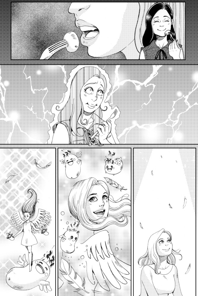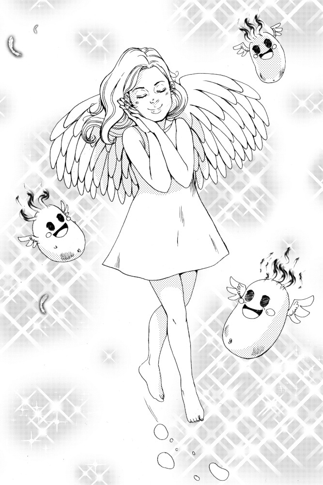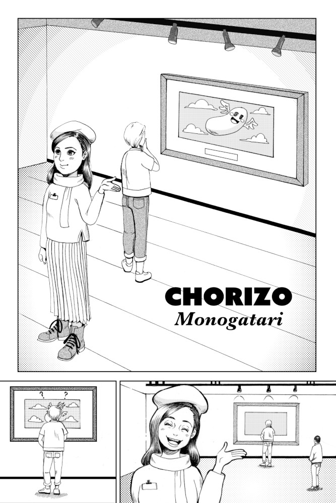 | “主人公がチョリソーの天使に囲まれているところを気に入ってます。シュールですが、可愛いですよね。” | |