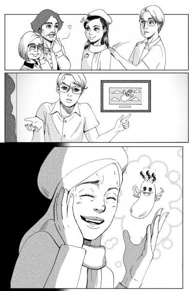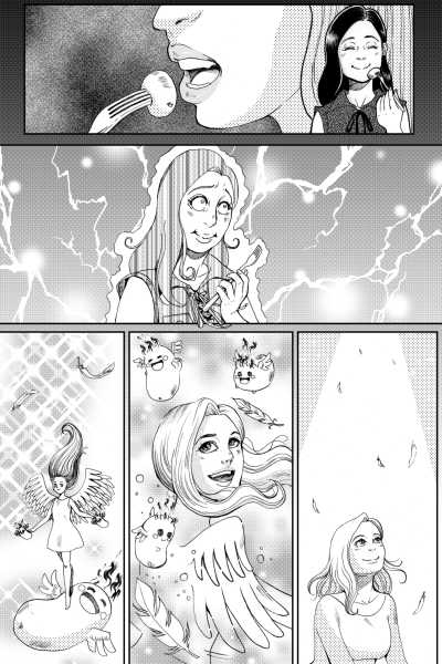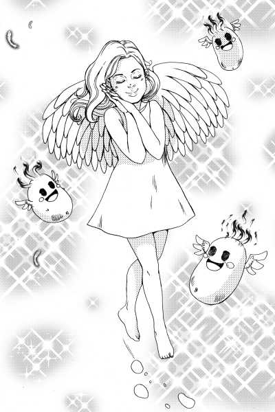 | “主人公がチョリソーの天使に囲まれているところを気に入ってます。シュールですが、可愛いですよね。” | |