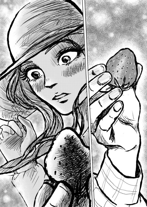 | “彼女が……! その瞬間の男の照れた表情。” | |
