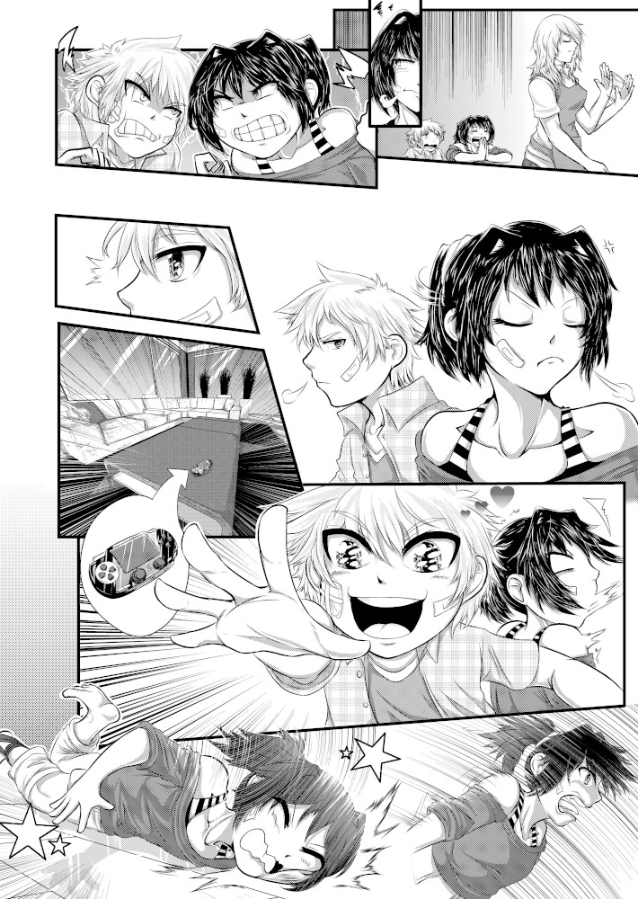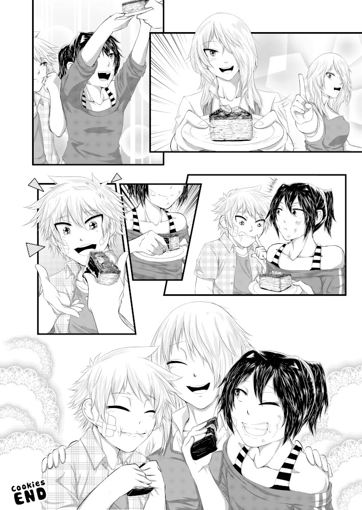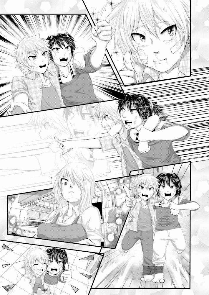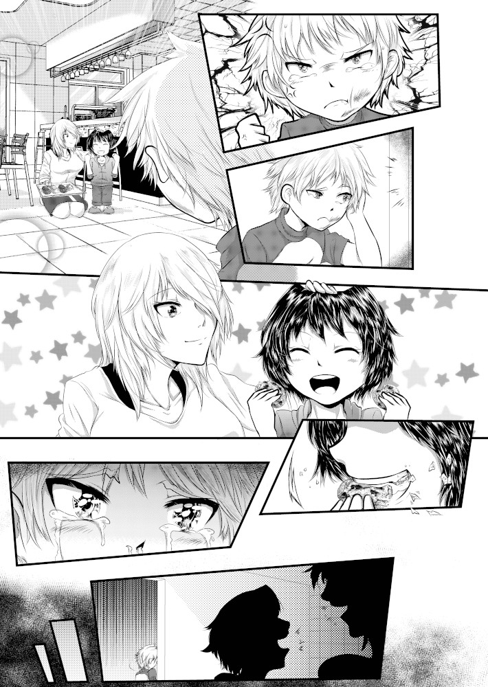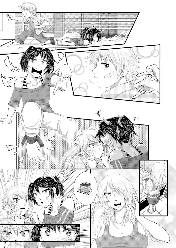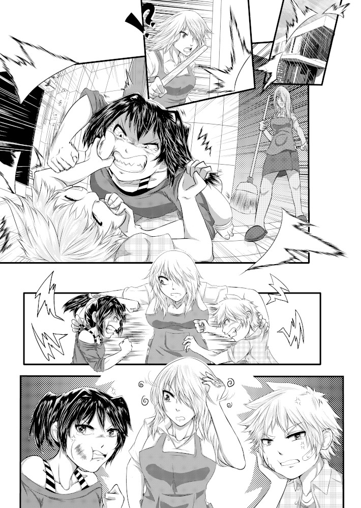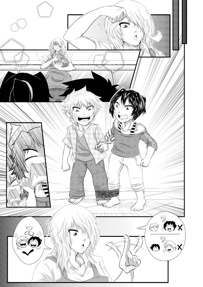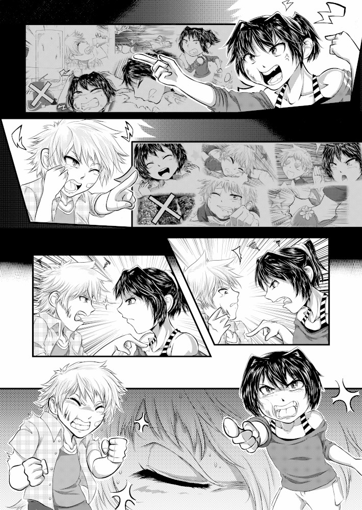 | “It's funny, when I was drawing my manga, I felt like I was looking at my old reflection, since I was 7-10 years old, with my sister. We used to fight each other just for the simplest thing, because we both were rivals at the time. And also we always being scolded by our mom, even though it's useless because we did it over and over. XD So I made this based on my experiences with my little sister. So nostalgic, reminds me the old times since I was a child. I think the double-paged spread is the hardest part of all, because it was the first time for me to draw manga by using 2 pages simultaneously. And I also laugh when I see the children are being tied by their mother, and it's reaction, it's really really got the feeling. Oh yes, here's the name of the characters : 1. Mother - Jenny 2. Girl - Milleva 3. Boy - Jean” | |
